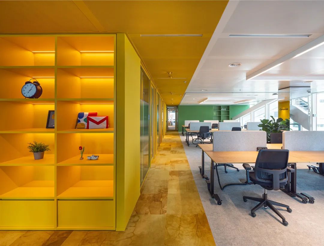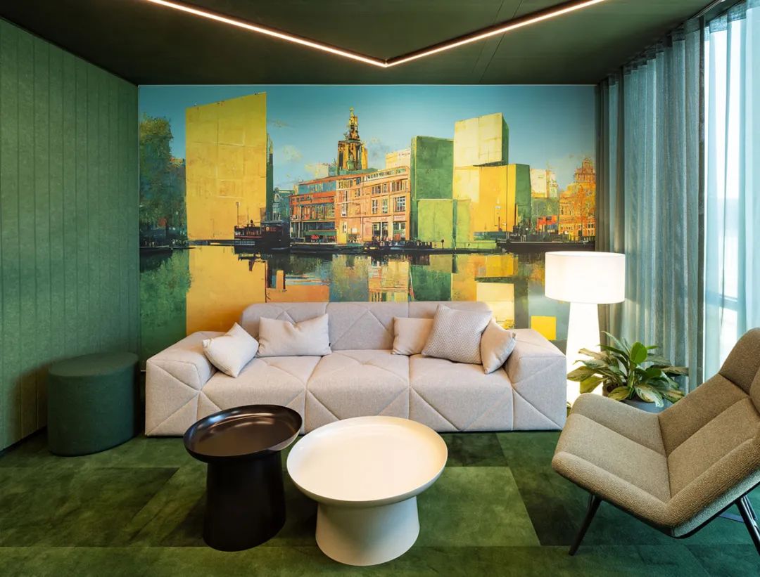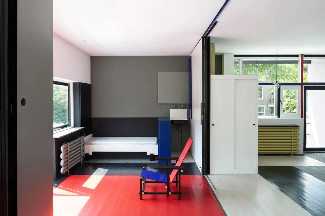 设计深度融合荷兰“风格派(De Stijl)”艺术基因,以几何线条、三原色(红、黄、蓝)与非色彩(黑、白、灰)构建办公环境的视觉语言。定制的办公家具如“红蓝椅”复刻版座椅、模块化几何拼接办公桌,直接呼应风格派代表人物蒙德里安的抽象构图理念。这种设计不仅强化了空间的艺术辨识度,更通过色彩分区帮助员工快速定位功能区域(如红色区域为创意协作区,蓝色区域为专注工作区),实现美学与实用性的统一。