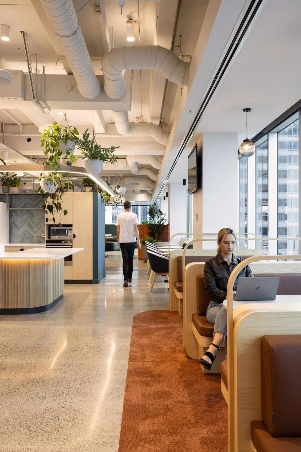 设计灵感源自新西兰"kiwi bach"海滩小屋,强调室内外流动与自然光利用。18层空间通过落地窗引入自然光,原木色办公家具搭配绿植,营造开放宁静氛围。摒弃传统格子间,采用协作区与独立工作区结合的灵活布局,使办公环境同时满足专注与互动需求。