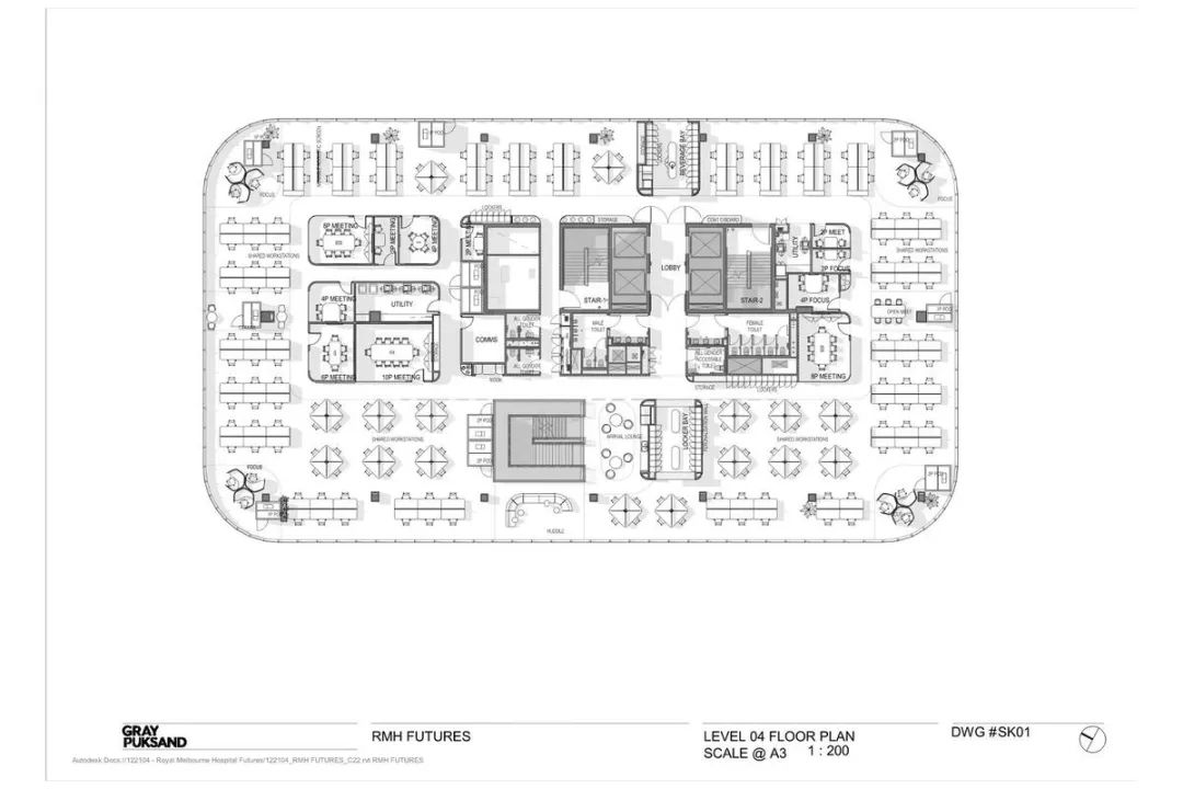 2025年,拥有175年历史的澳大利亚皇家墨尔本医院(RMH)完成了一项意义非凡的空间升级——将800多名员工迁至墨尔本中央商务区伊丽莎白街的全新办公大楼。这座由Gray Puksand设计团队操刀的9500平方米办公空间,不仅是物理地址的迁移,更是医疗办公场景下办公环境设计理念的彻底革新。项目通过定制家具与亲生物设计的深度融合,重新定义了医疗工作者与患者的空间体验,让"人是目的"的核心价值观从标语转化为可触摸的空间语言。