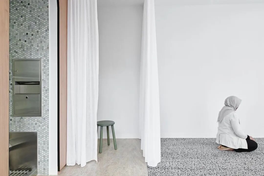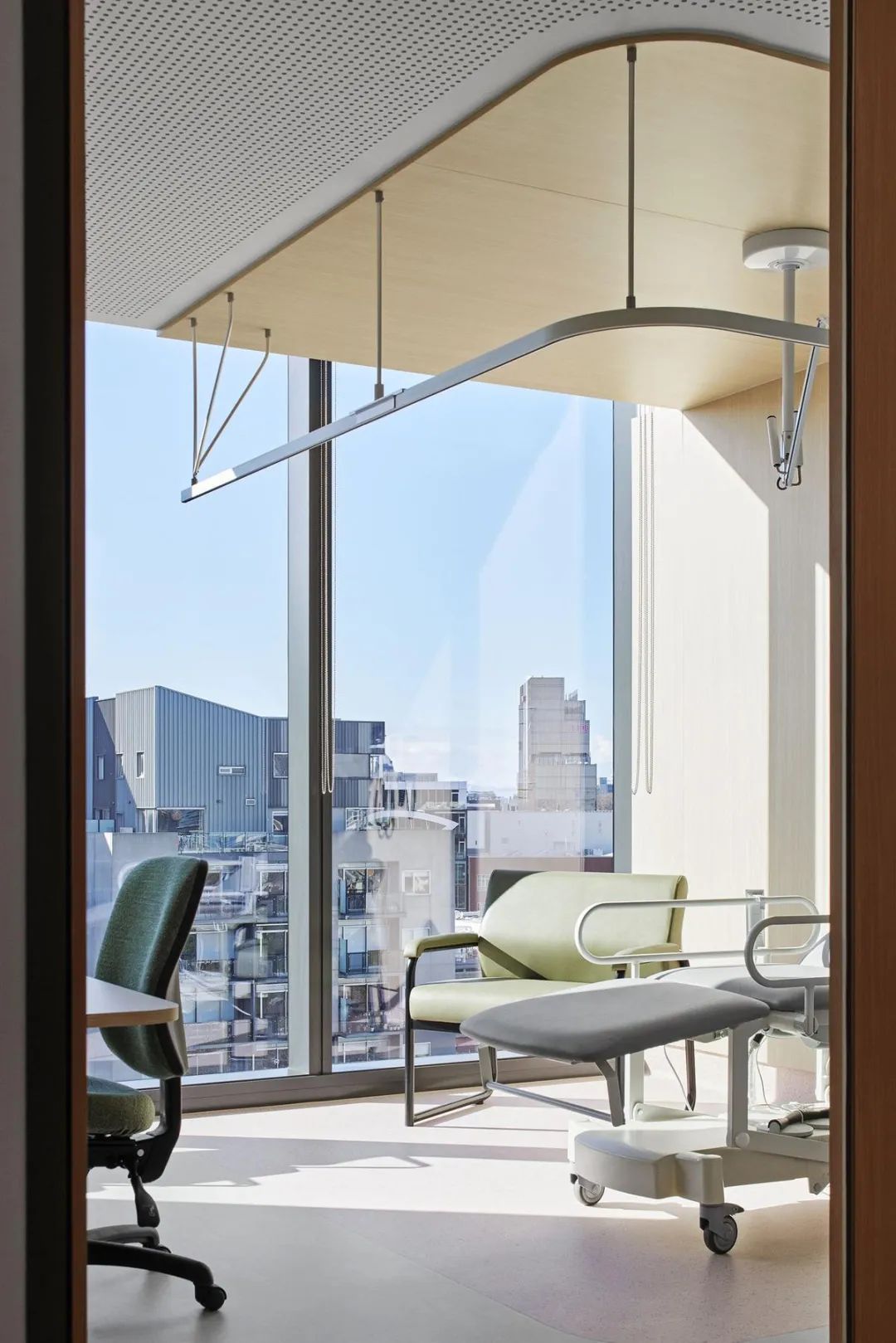 最具创新性的设计在于员工休息区与患者等候区的"边界渗透"。位于三楼的空中花园连接着护士休息区与康复门诊,这里的定制花箱座椅同时服务于医护人员的短暂休憩与患者的康复活动。"当我看到医生和患者在同一空间里各自阅读,那种打破身份隔阂的平静画面,正是我们追求的'相互支持的护理环境'。"Gray Puksand的项目设计师如此描述。