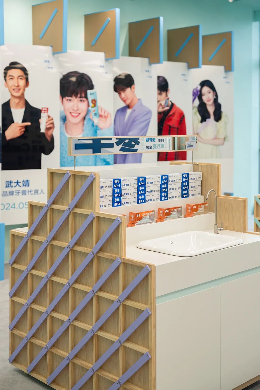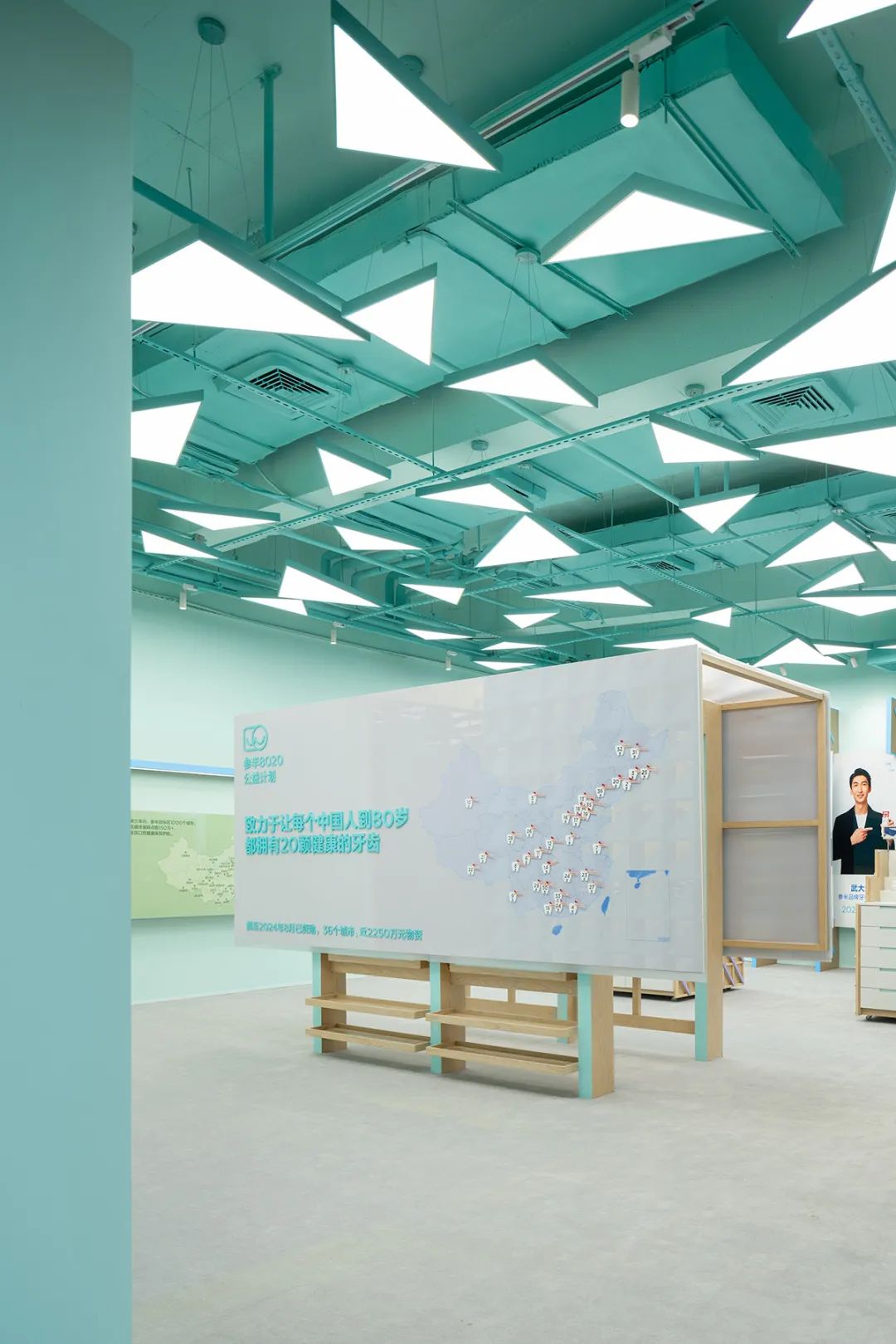 以浅黄与天蓝色为主色调,结合金属与木质材质,传递口腔护理行业的洁净感与科技感。