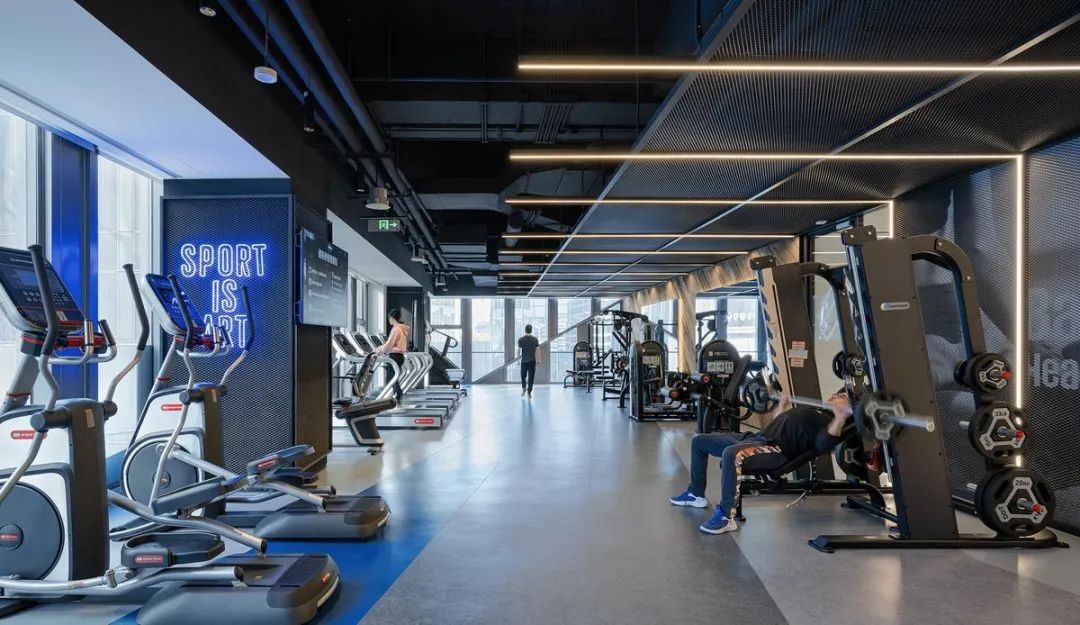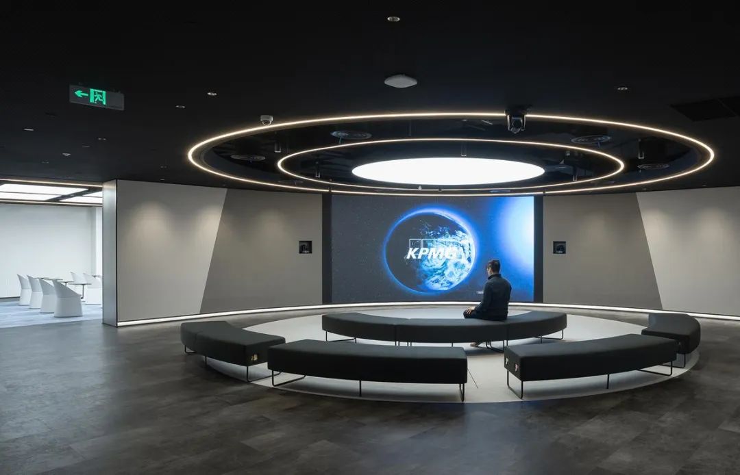 KAMPUS 的健身房和动感单车房,将健康理念融入办公环境设计。专业的健身器材与定制化的运动空间相得益彰,其中动感单车房的设计尤为亮眼:超大屏幕配合沉浸式灯光系统,营造出梦幻的运动氛围。这里的办公家具(运动设备)选择不仅注重专业性,更考虑了使用者的体验感,即便是不喜欢运动的小伙伴,也会忍不住想体验一把。这种将健康空间纳入整体办公环境规划的做法,体现了毕马威对员工福祉的全面关注。