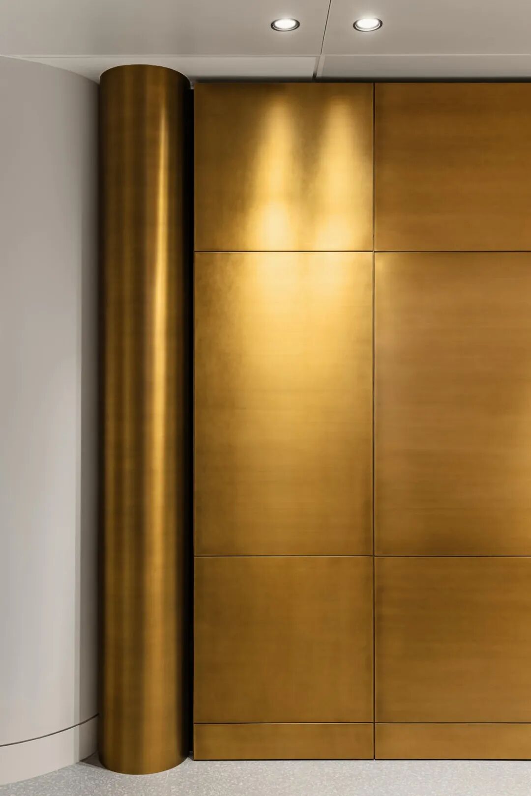 本案最引人注目的金色花瓣装置,是一个六米高的可旋转金属隔断。这个由天然黄铜打造的几何构造,通过独特的枢轴铰链与隐藏式滚动系统,仅凭一人之力即可完成空间转换。当它旋转至不同角度时,核心区可分别变身为董事会会议室、新闻发布厅或员工创意工坊。