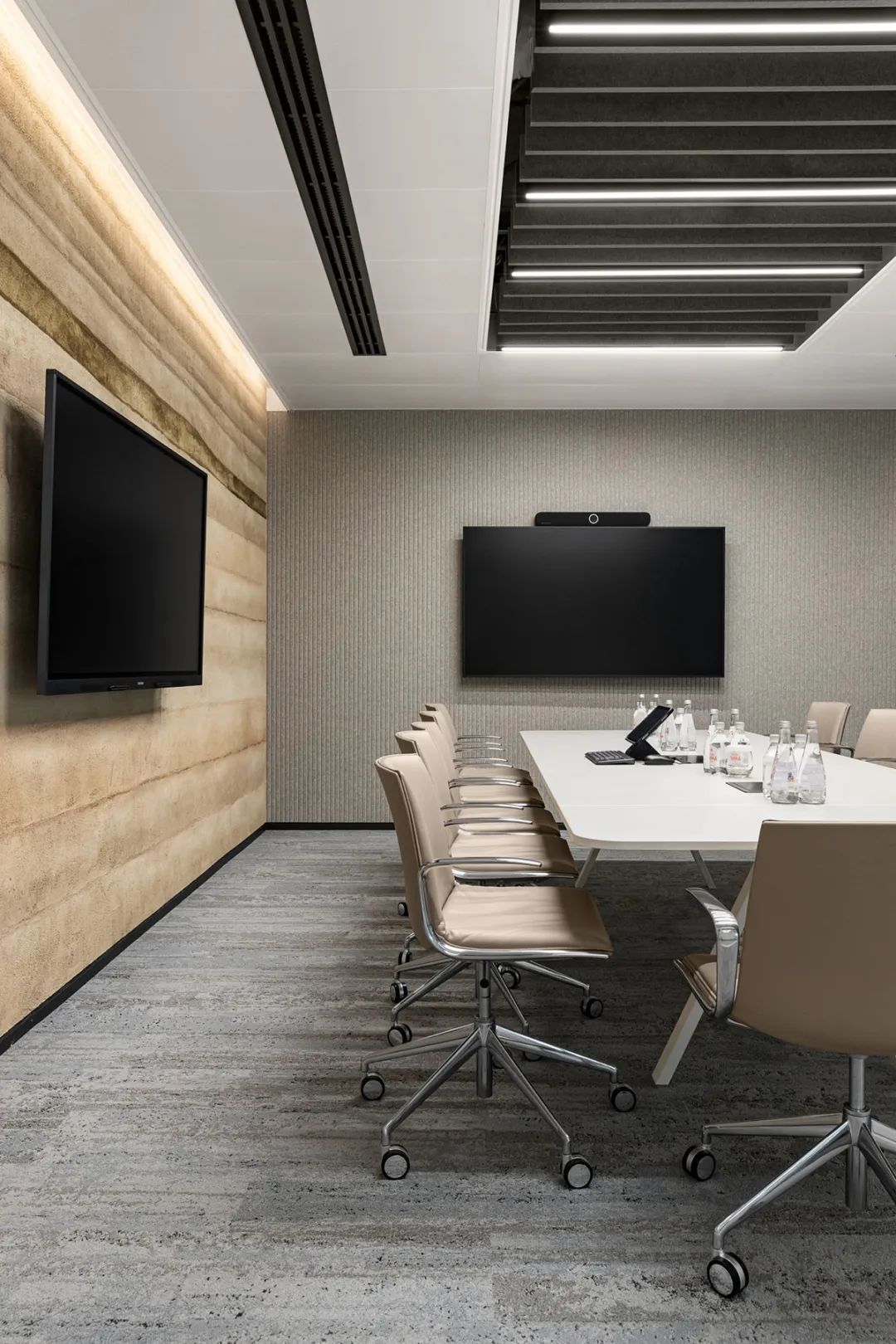 针对迪拜的气候特点,办公室配备了工业级别的环境控制系统:隐藏式除湿机组、分区温控面板与空气净化系统,确保即使在 50℃ 高温天气下,室内仍维持 24℃ 的舒适环境。而天花板上方的综合布线系统,采用了公司自主研发的高密度连接器,让每个工位都能支持 10G 网络传输。
