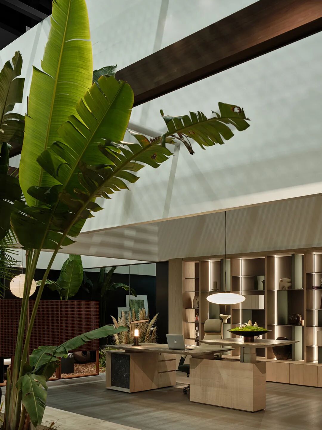 最终,设计方案从自然出发,以景观中庭为精神蓝本,用峡谷廊道来重塑参观节奏,在森林办公室中完成现代办公方式的诗意转译。这个展位不再只是产品的容器,更是"生活即办公"理念的立体注解。