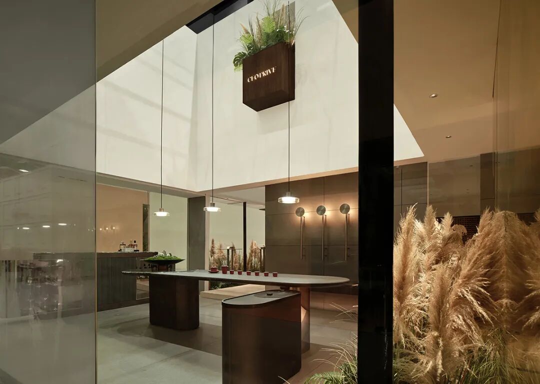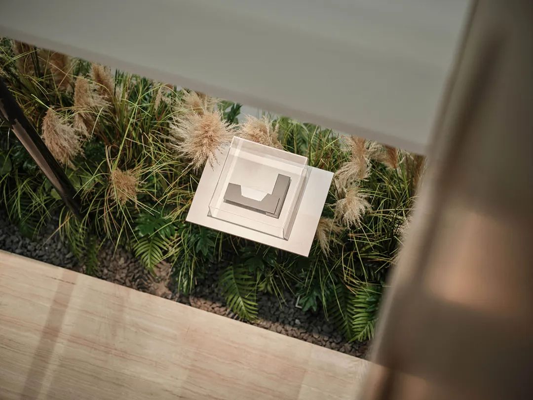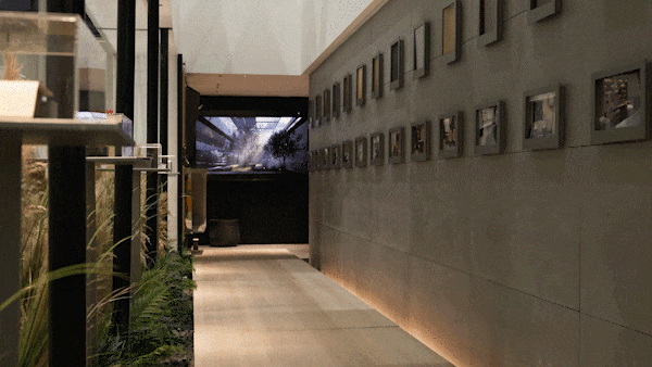 最引人注目的是四方围合的卡座区,这里体现了当代"四合院"的精神内核。在空间叙事的高潮处,团队特意设置了一处冥想驿站。残缺的陶罐与烛台在青苔与芦苇的掩映下,营造出苏轼"泥上偶然留指爪"的时光诗意,让人们在观展疲惫时能在此稍作停留,沉淀思绪。