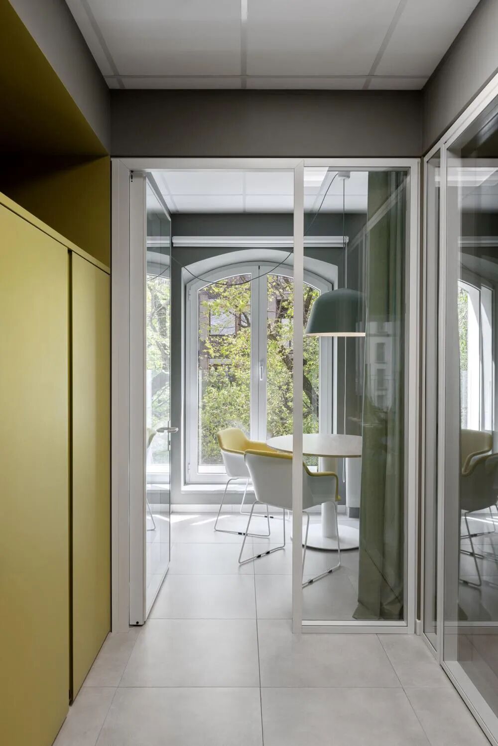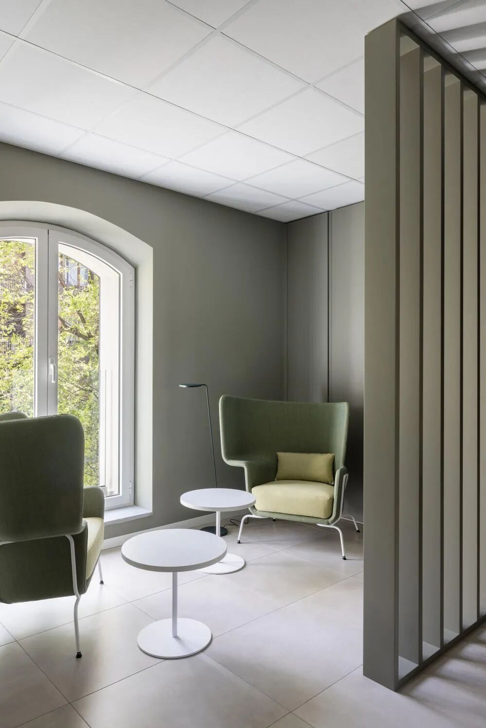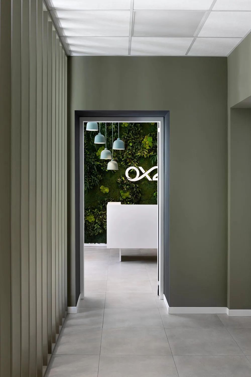 走进OX2米兰办公室,最先冲击感官的是贯穿始终的绿色系配色系统,其中鼠尾草色调的运用堪称点睛之笔。设计团队从可再生能源的自然属性出发,摒弃了工业感的饱和色,转而选择从蓝灰色到芥末色的渐变过渡,这种低饱和度的色彩组合既保留了北欧设计的冷静克制,又融入了意大利空间的温暖质感。