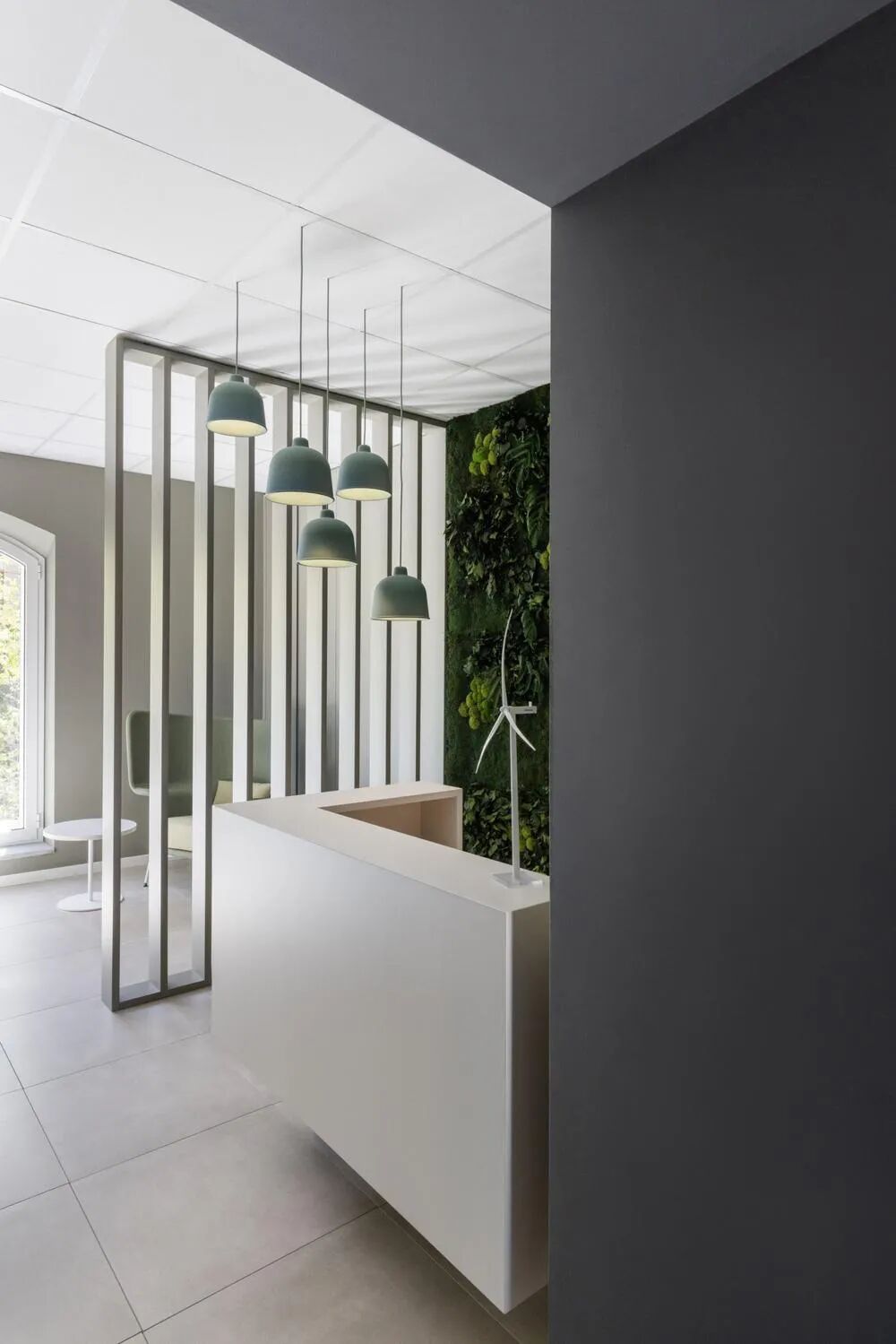 鼠尾草色调的精妙之处在于其双重象征意义:视觉上,它如同新能源技术中的高效转化器,将强烈的阳光柔化为舒适的室内光线;概念上,这种介于蓝绿之间的中性色完美诠释了OX2平衡技术创新与生态保护的企业理念。为强化这种自然联结,团队采用工艺加工后的绿植覆盖墙面,并将植物元素融入照明设备设计,使人工照明与自然元素和谐共生。这种色彩策略成功避免了"绿色"主题的表面化处理,让可持续理念通过视觉神经潜移默化地渗透到每位使用者的感知中。