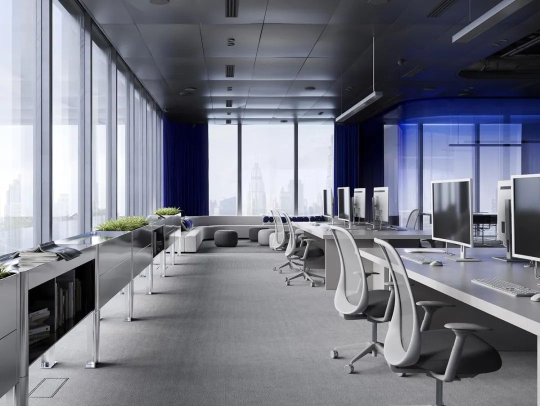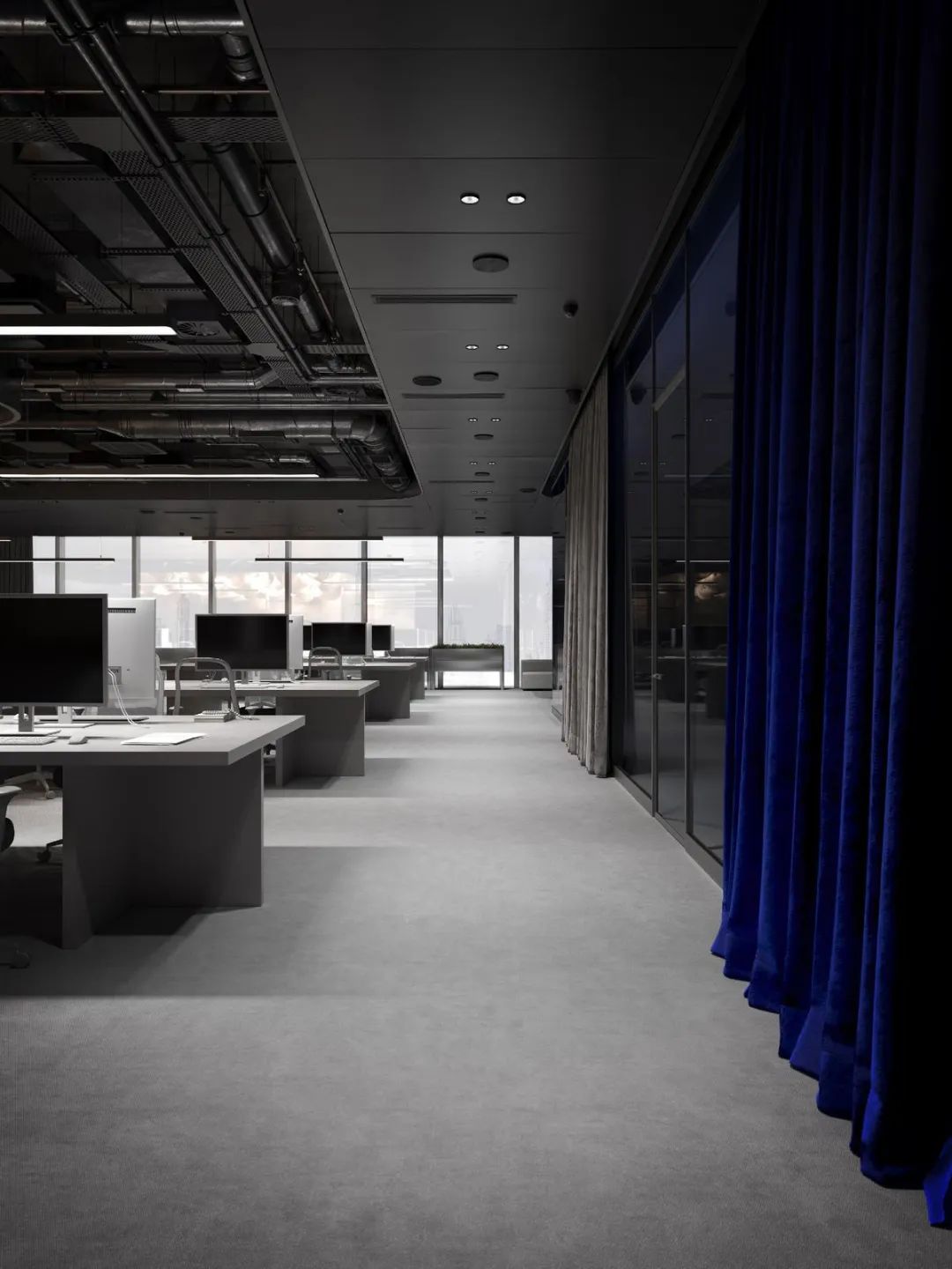 关键词:办公家具|办公环境设计|金融科技|极简主义|自然意象|视觉沉浸式体验|暗调黑白|暗蓝点缀|理性与感性|沙漠意象|品牌意境|定制家具