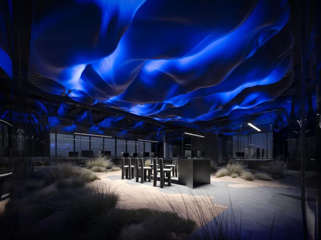 沙之胶囊:真实的沙漠植被在人工沙丘间生长,穹顶蓝色光幕如天光倾泻,以当代艺术手法诠释沙漠意象的永恒诗意。