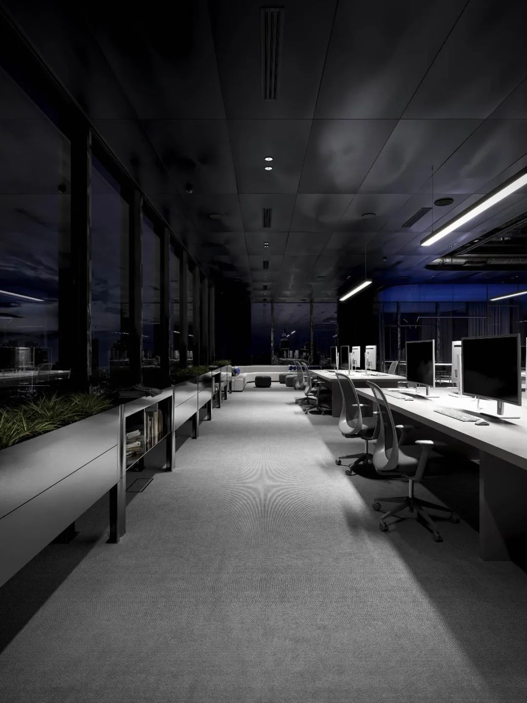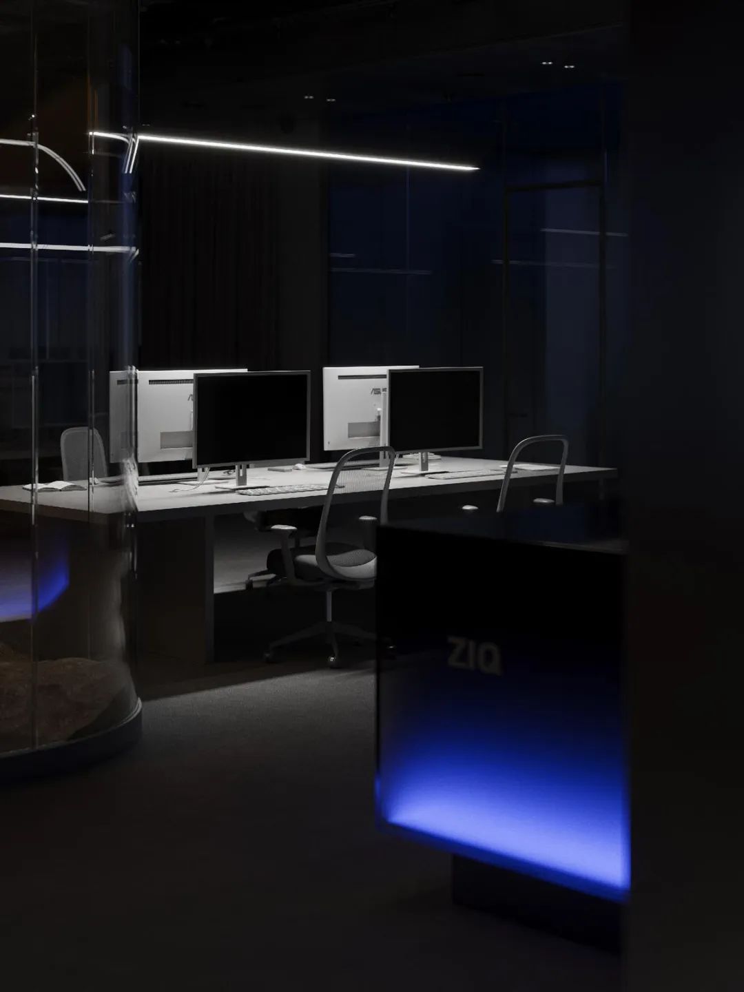 ZIQ迪拜办公室以极简主义为基底,将金融科技的精密感与沙漠意象的原始诗意深度融合。暗调黑白主色系中,深海蓝如星火般点缀,冷峻金属、通透玻璃、温润织物与粗粝沙砾交织,构建出层次分明的材质交响曲。照明系统既是功能载体,亦是空间情绪的调控者——精准的光影切割延伸了三维纵深,让每一寸空间都成为视觉沉浸式体验的舞台。