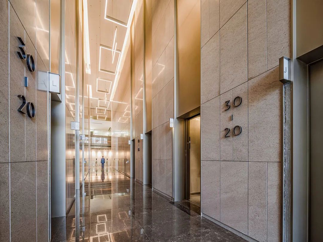 高达 11 米的环通大堂,通过大理石立面多层次进退及同种大理石亚光面和皮革面的结合,搭配金属勾勒的细节线条,增添了空间的韵律感与精致细节。柱子上运用同样的材质结合灯槽勾勒出与核心筒的对话,嵌入核心筒的岛型接待台,多种手法结合使得大堂视觉更加丰富。结合精心设计的灯光效果,整个大堂空间既凸显了材质的质感,又烘托出自然温馨的人文感受。