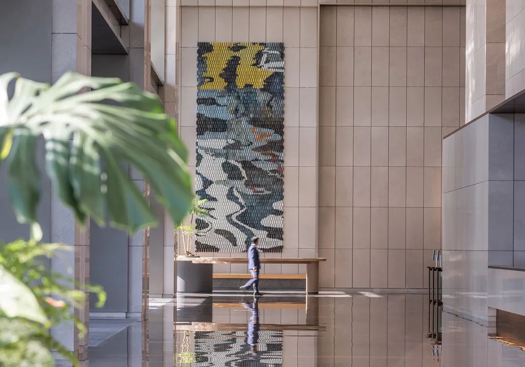 空间里的大台阶不仅将办公和商业无缝衔接,台阶上结合绿植与木制座椅打造的驻足空间,让人们拥有自然舒适的体验。毗邻的室内水景创建了亲水人文艺术长廊,赋予了大堂空间全新的共享环境。这个空间作为大堂通往商业的主动线,打开了原本封闭的墙面,使得大台阶上的人流也能很好地欣赏艺廊,同时也为租户提供了快闪艺展的平台,极大地丰富了办公人群的精神文化生活。