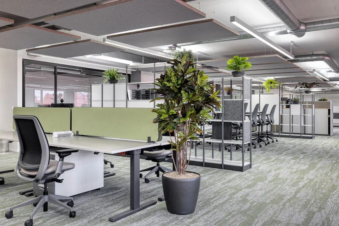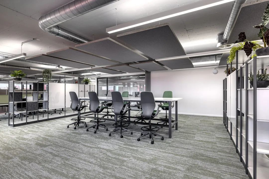 开放式办公的最大挑战,莫过于如何在促进交流的同时避免噪音干扰。Knuchel Farben的解决方案堪称教科书级:全高声学玻璃墙与吸音板的组合,将空间混响时间控制在0.8秒以内(普通开放办公室通常超过1.5秒)。工作台上方的声学天花板与桌面屏风形成“双重隔音屏障”,即使团队同时讨论,也能保持相对安静的环境。