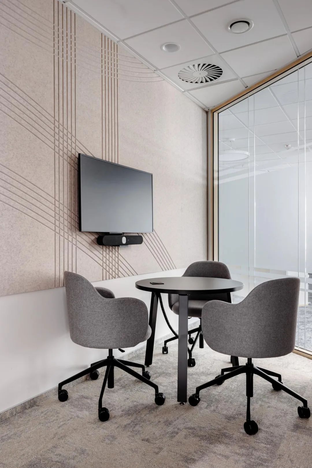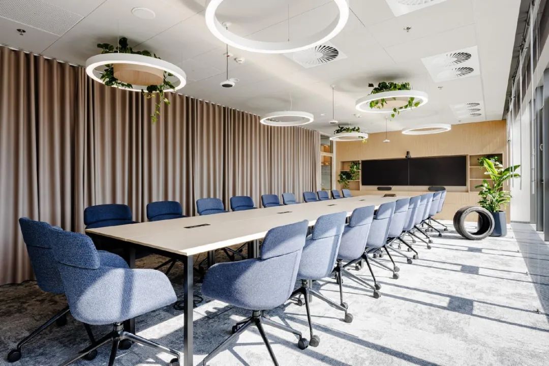 定制家具则成为品牌DNA的载体:圆形接待台复刻轮胎力学结构,会议室声学装饰板表面纹理还原雨天轮胎轨迹;海军蓝沙发、轮胎花纹地毯及咖啡杯印花,将"行走的设计"主题贯穿空间。环形吊灯与弧形屏风等元素,更实现照明/隔断功能与品牌意象的双重表达,使办公空间成为品牌文化的三维教科书。