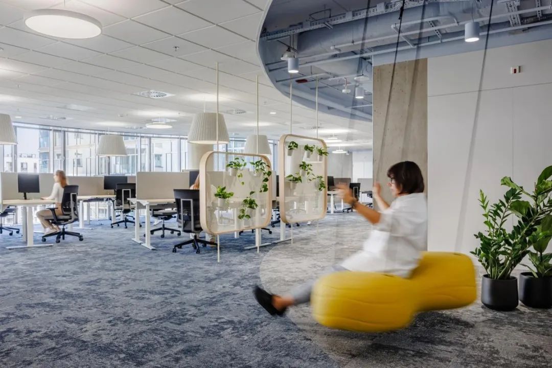 关键词:办公家具,办公环境设计,定制家具,制造/轮胎,舒适体验,美学与人体工学,员工福祉,开放协作,共享工作,品牌DNA,亲生物设计,圆形蓝色,品牌标识,秋千椅