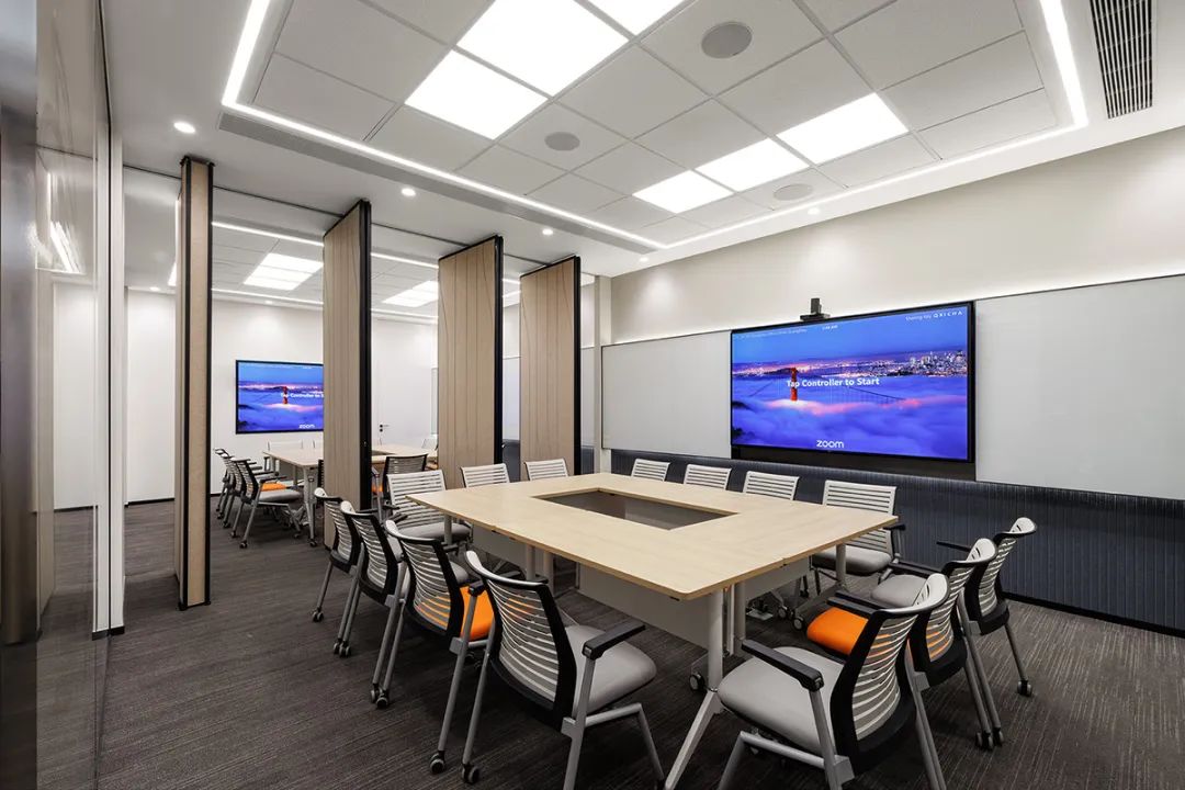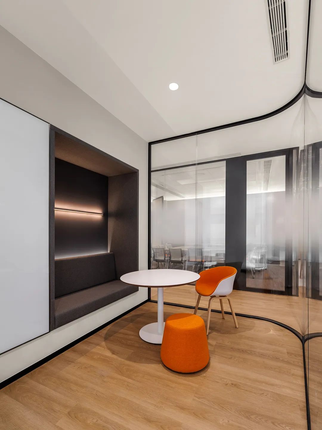 二合一会议室运用木质元素与顶面线形灯光,打造出舒适温暖且清透的空间氛围,激发了参会者的想象力与活力。小型会议室以玻璃淡化边界,最大程度引入自然光与自然景观,使空间有序而通透。橙色作为点缀色,为黑白灰为主的空间注入了生命力,实现了视觉简洁与功能实用的完美平衡。