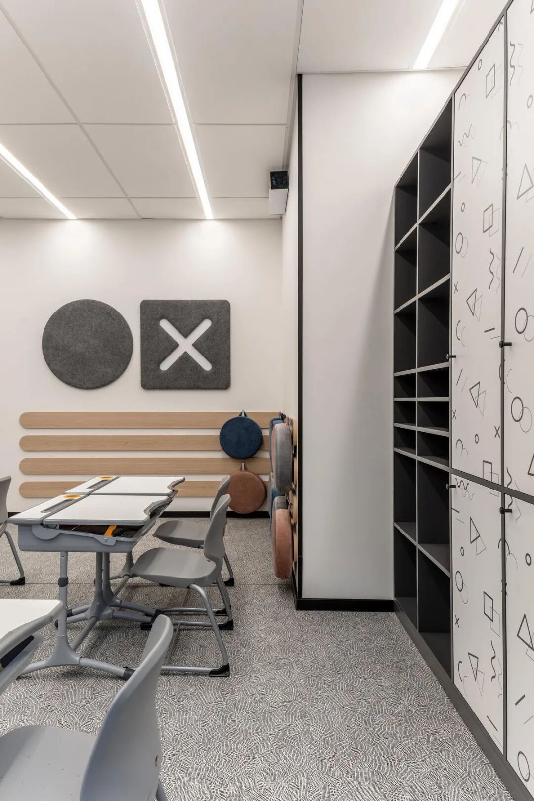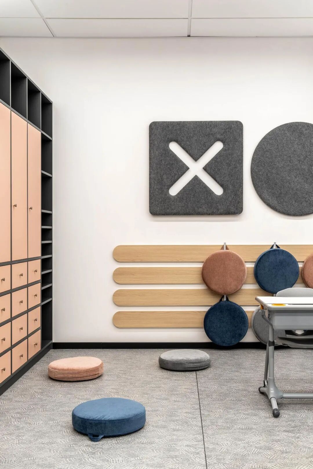 校园整体采用时尚简约的设计风格,以粉彩配色为基调,营造出柔和而充满活力的氛围。这种色彩选择不仅符合儿童审美,更能有效缓解学习压力,激发想象力。每一处空间都经过精心规划,从入口区到储物柜区,从游乐走廊到四间标准教室,处处体现着灵活多元的设计理念。每间教室可容纳12名学生,配备了现代化的校园家具,支持渐进式学习系统,让教学活动能够根据不同需求灵活调整。