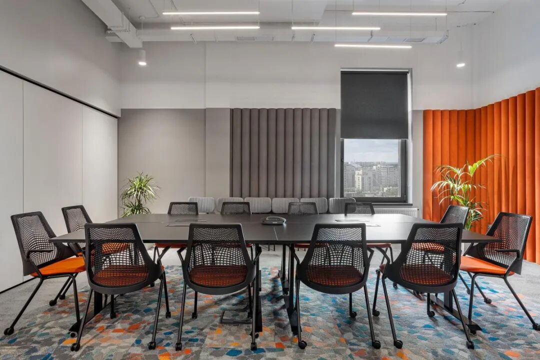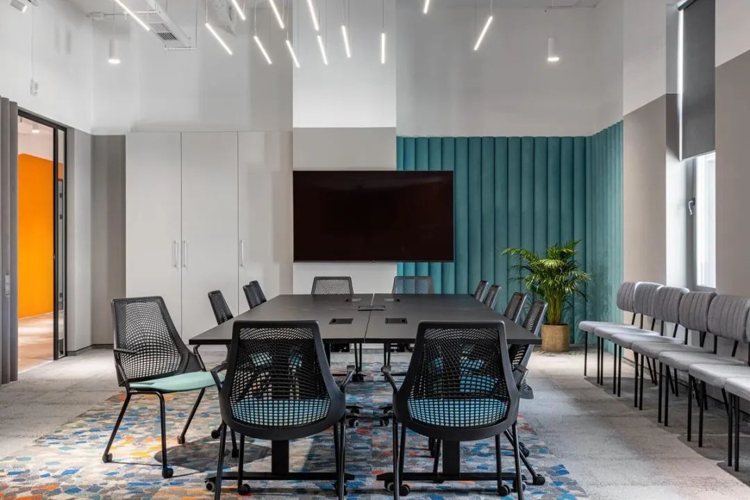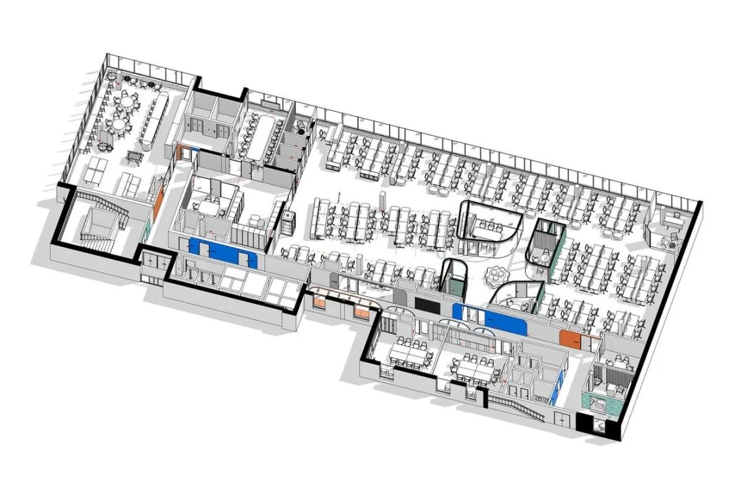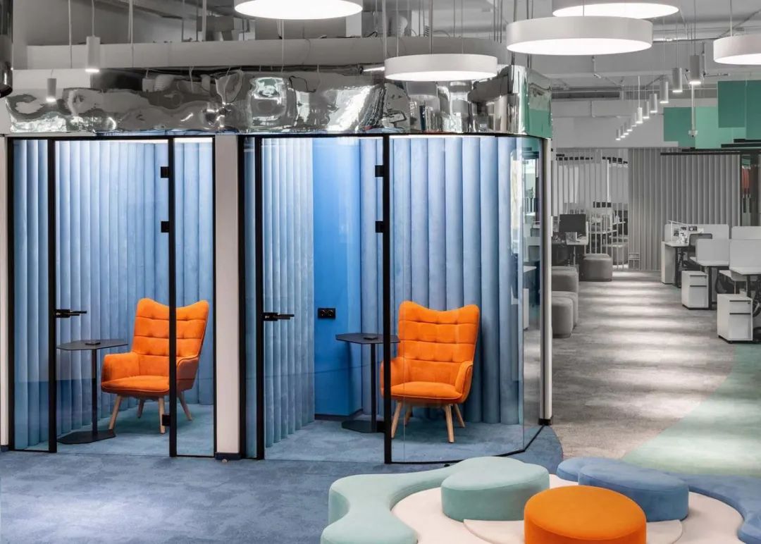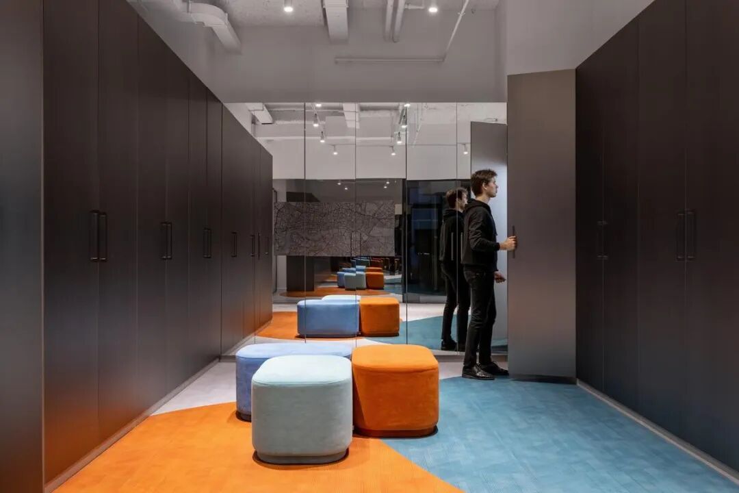 品牌诠释是本案最具辨识度的设计语言。Tripledot徽标的蓝色、橙色和绿色成为空间色彩的核心来源,通过色彩分区、饰面选择和软装搭配,将品牌基因深度植入空间肌理。更值得一提的是,徽标的有机形态被转化为定制DIY的设计元素,从墙面装饰到家具造型,随处可见的品牌符号不仅强化了空间的辨识度,更让员工在日常工作中时刻感受到品牌文化的浸润。