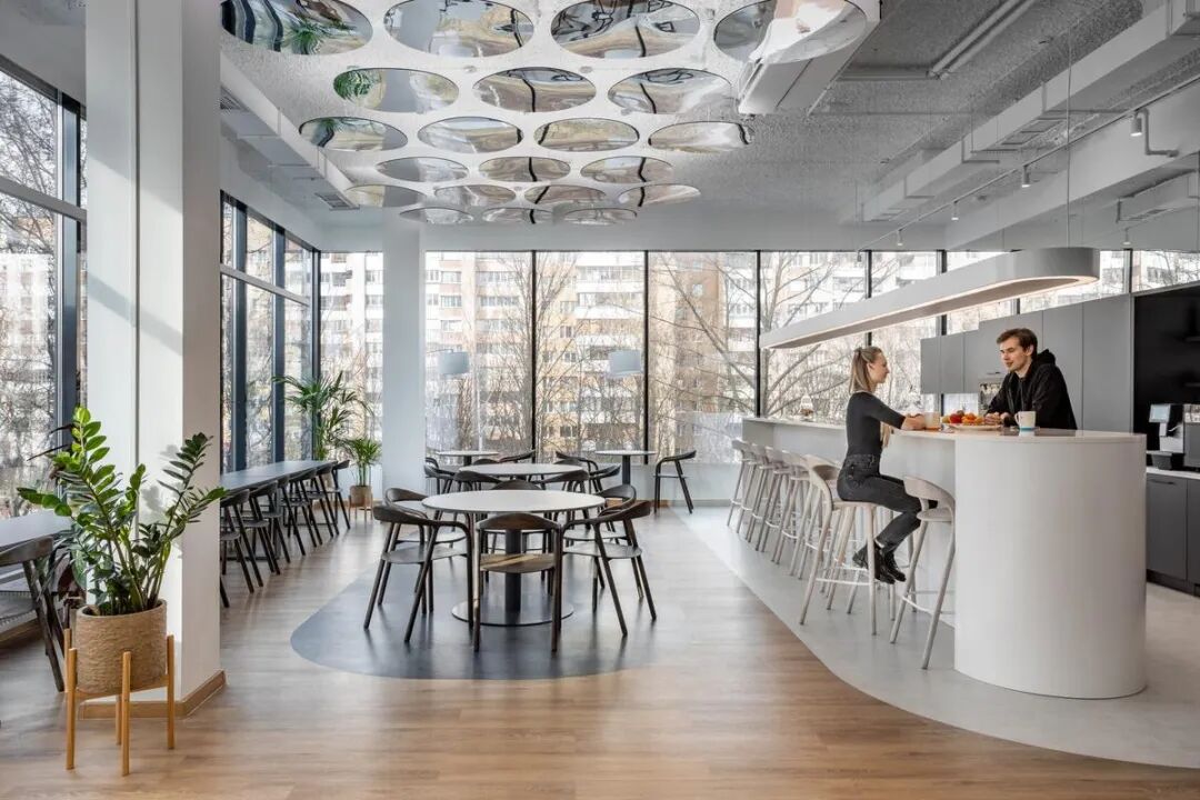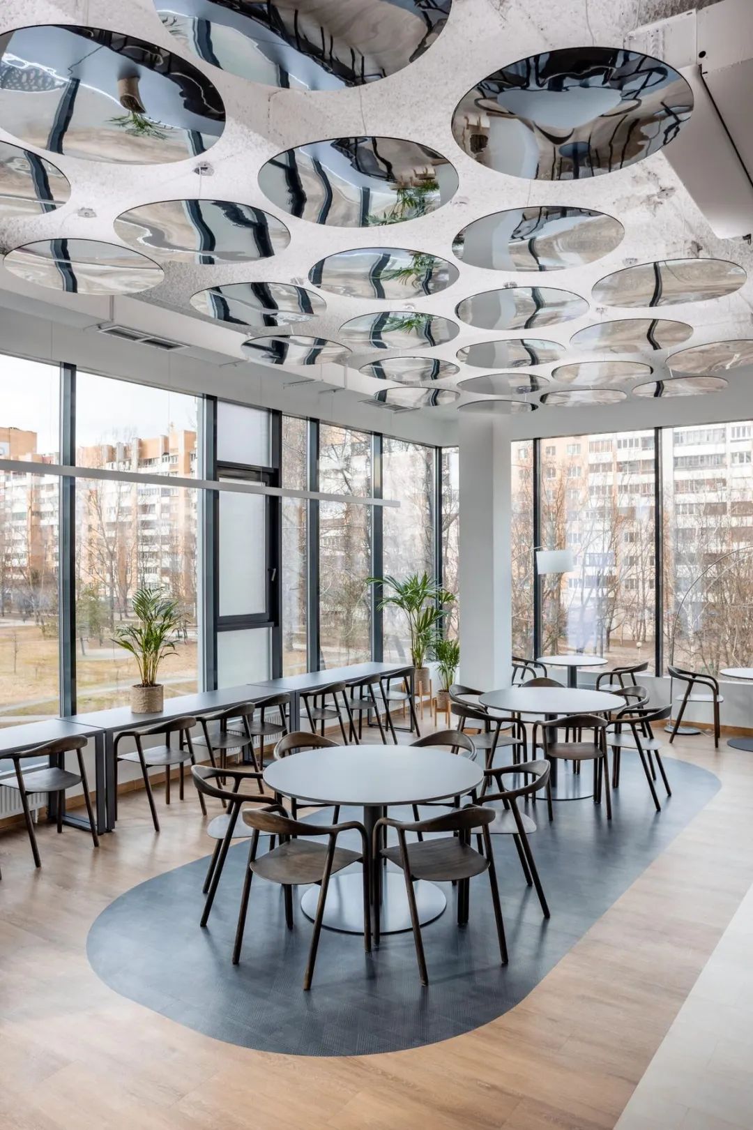 自然光的最大化利用是本案的另一特色。通透的落地窗将明斯克的自然光线引入室内,不仅营造出明亮通透的空间感,更通过生物学效应提升员工的情绪与工作效率。休闲咖啡区被精心设置在视野最佳的角落,多样化的办公家具为员工提供了从专注工作到轻松社交的多元场景选择,完美适配游戏行业灵活多变的工作模式。