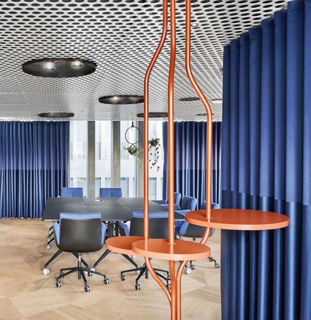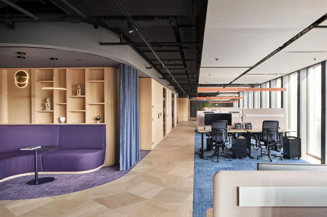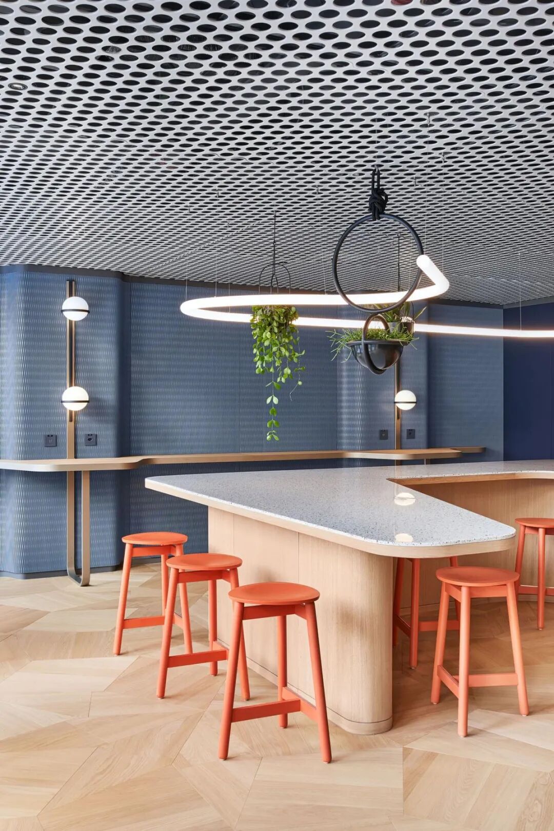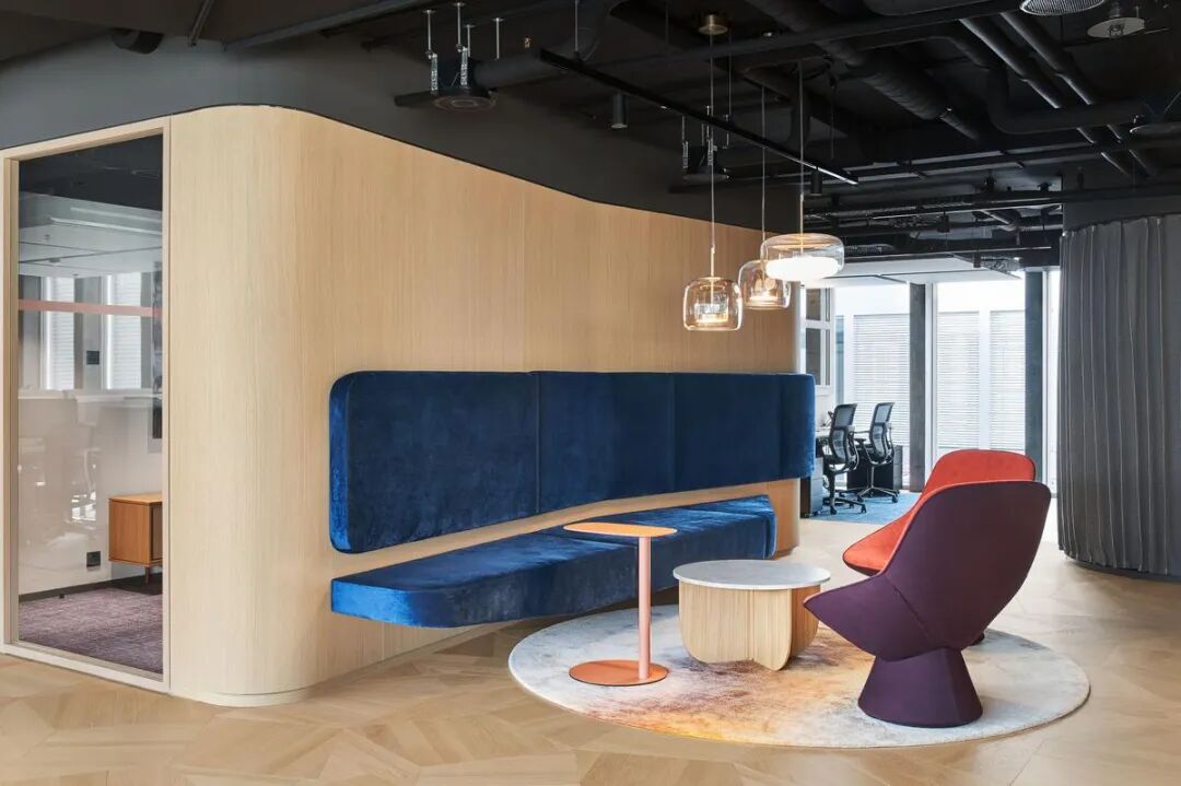在商业环境设计策略上,团队巧妙利用原有建筑不规则平面,通过“圆角”造型、嵌入式座位及视觉分隔手法,最大化空间功能与流动性。尤为突出的是办公家具的选用与布置:会议室采用五彩金属墙板提升视觉温度;织物墙板、多边形橡木地板与镶嵌式地毯相结合,营造出酒店般的精致氛围。这些通常见于高端酒店的材质与办公家具配置,显著提升了空间的舒适度与美学格调。