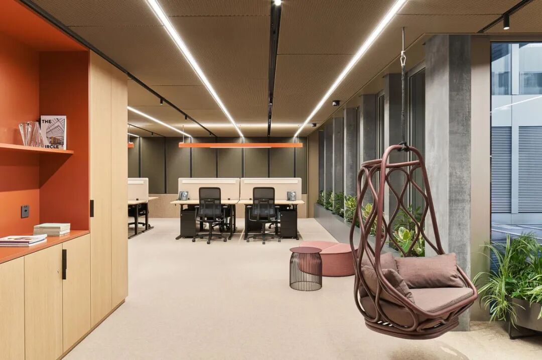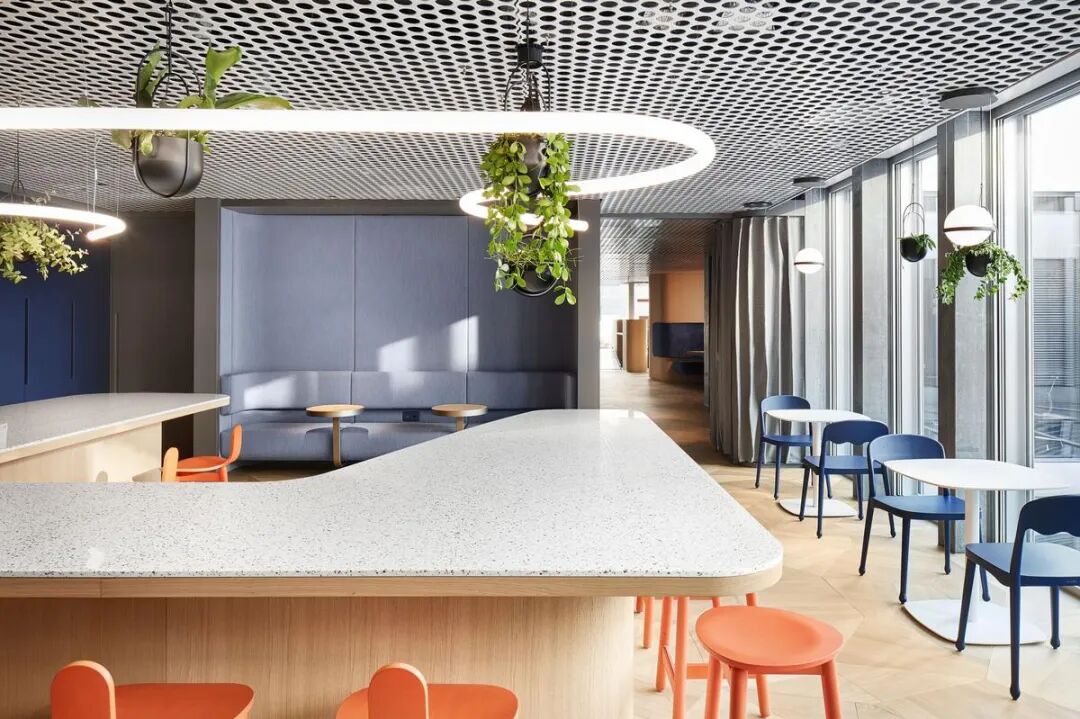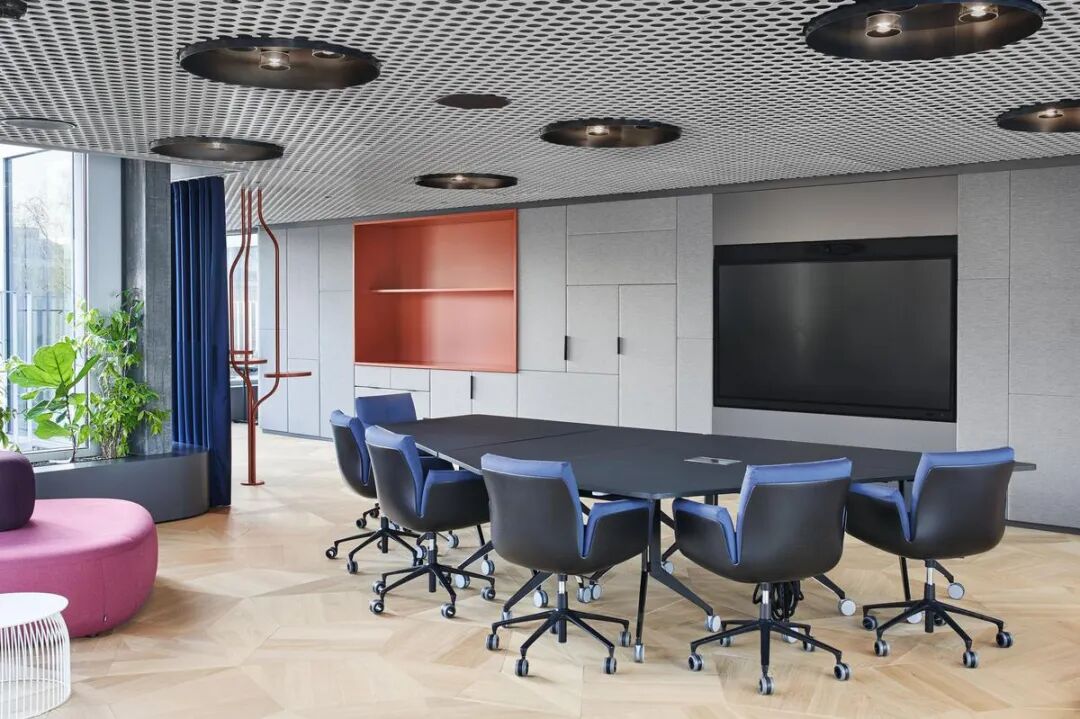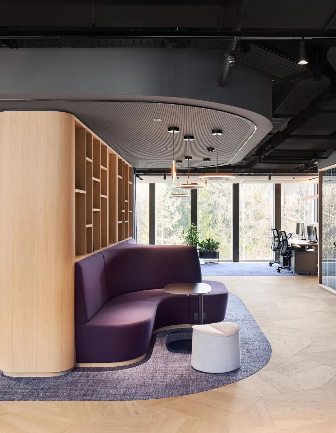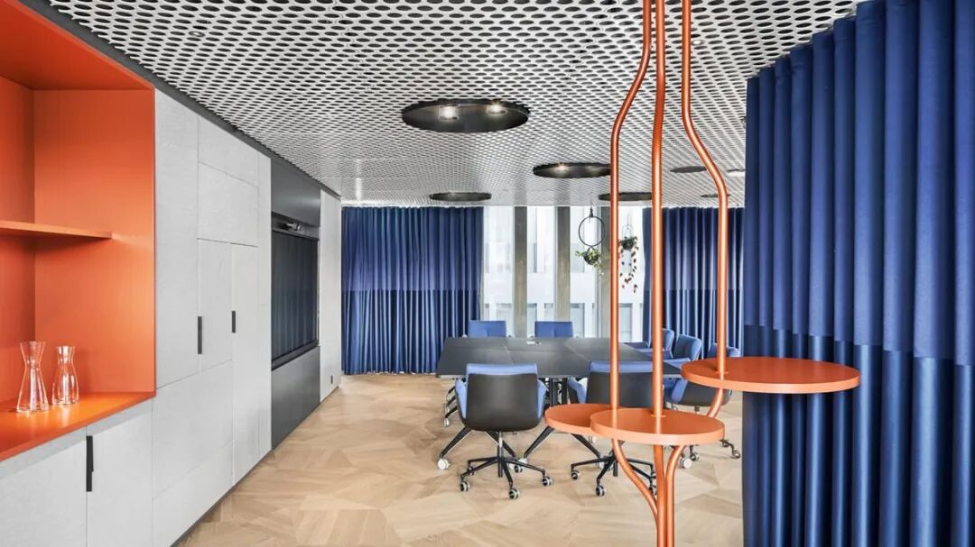 在商业环境设计策略上,团队巧妙利用原有建筑不规则平面,通过“圆角”造型、嵌入式座位及视觉分隔手法,最大化空间功能与流动性。尤为突出的是办公家具的选用与布置:会议室采用五彩金属墙板提升视觉温度;织物墙板、多边形橡木地板与镶嵌式地毯相结合,营造出酒店般的精致氛围。这些通常见于高端酒店的材质与办公家具配置,显著提升了空间的舒适度与美学格调。