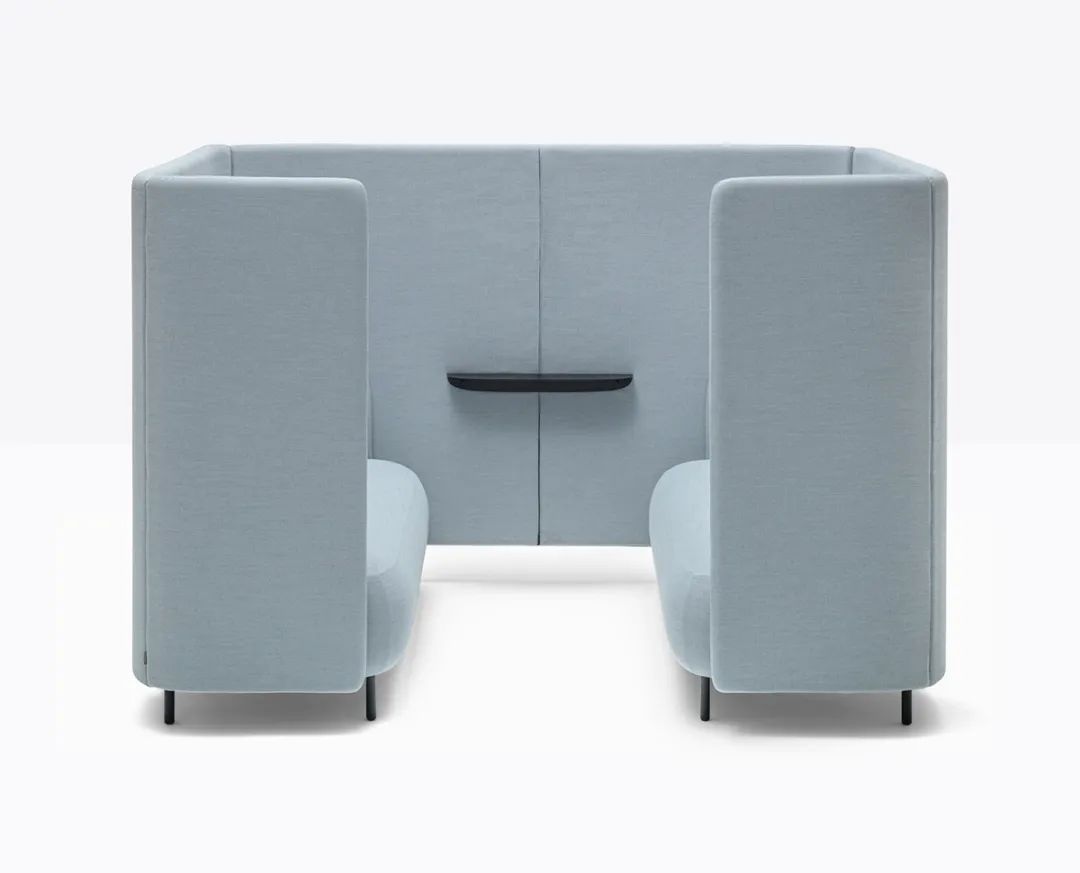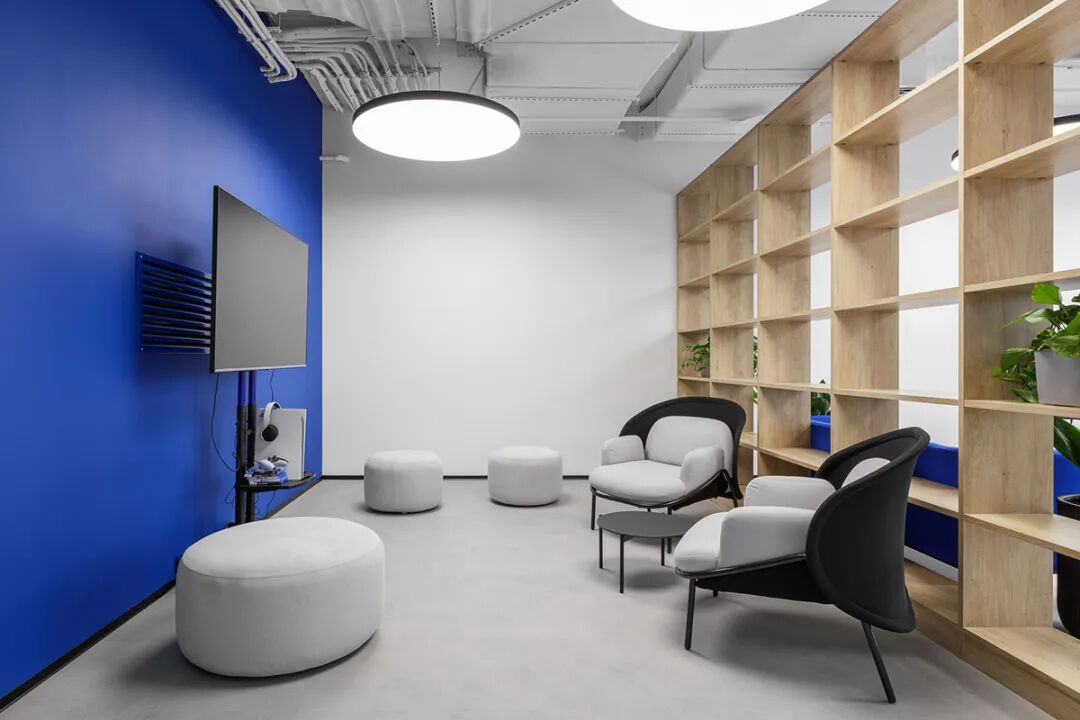 本案以“蓝色极简美学”为核心脉络,将科技公司理性、前瞻的特质与宁静、优雅的美学追求相结合。蓝色在科技领域中虽常见,但此处通过大面积的纯净色块,与极简的白色体量、黑色细节形成鲜明对比,营造出深邃而时尚的氛围。尤为重要的是,蓝色调并非仅用于墙面或装饰,而是巧妙延伸至办公家具之中——从协作区的沙发、会议椅到专注工作舱的内饰,蓝色以不同明度与材质呈现,使整体视觉连贯且富有层次。家具的选型同样呼应极简原则,线条流畅、造型简约,强化了空间的现代感与整体性。