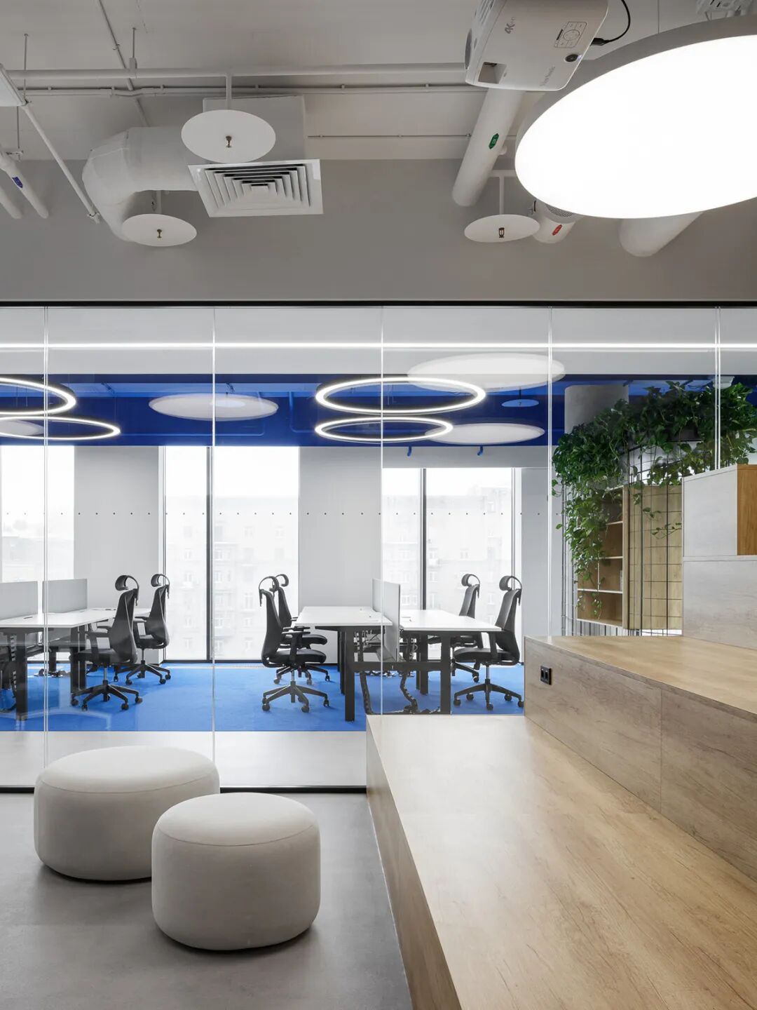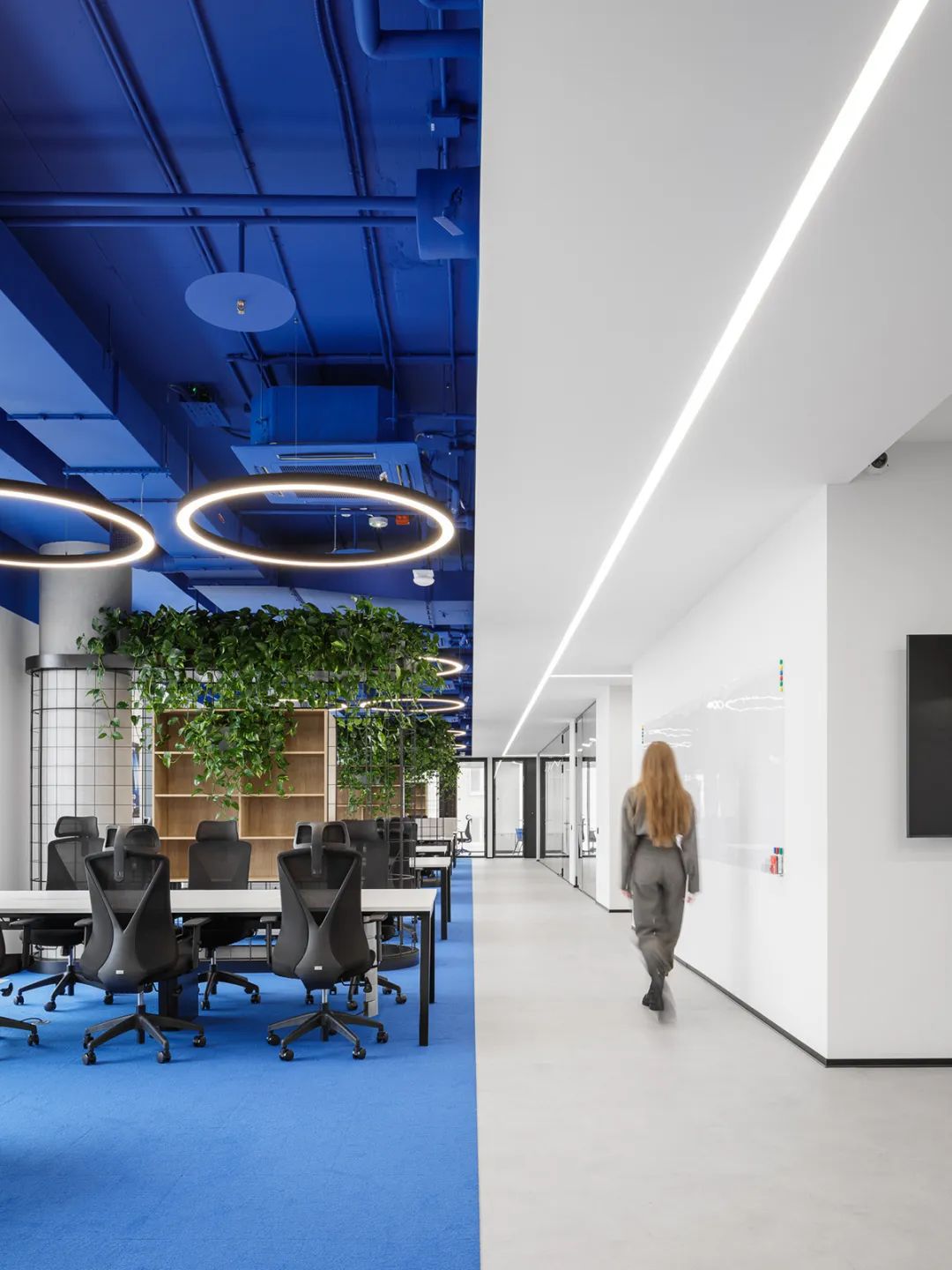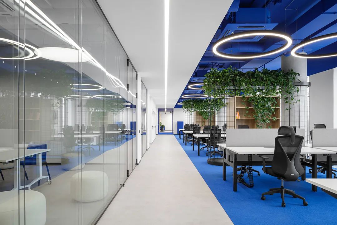 此外,绿植藤蔓的融入为冷静的蓝白空间注入生机,提升了环境的舒适度与愉悦感。研究显示,良好的办公环境设计能显著提升员工的幸福感与生产力——在本案中,通过对色彩、光线、家具与布局的整体把控,不仅塑造了一个时尚唯美的美学空间,更构建了一个能激发灵感、提升效率、增强归属感的办公场所。对于 INNOTECH 这样的科技企业而言,这处空间无疑成为了支持其创新文化与持续发展的重要基石。