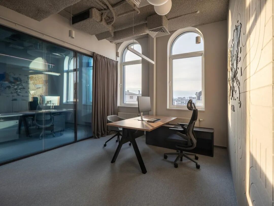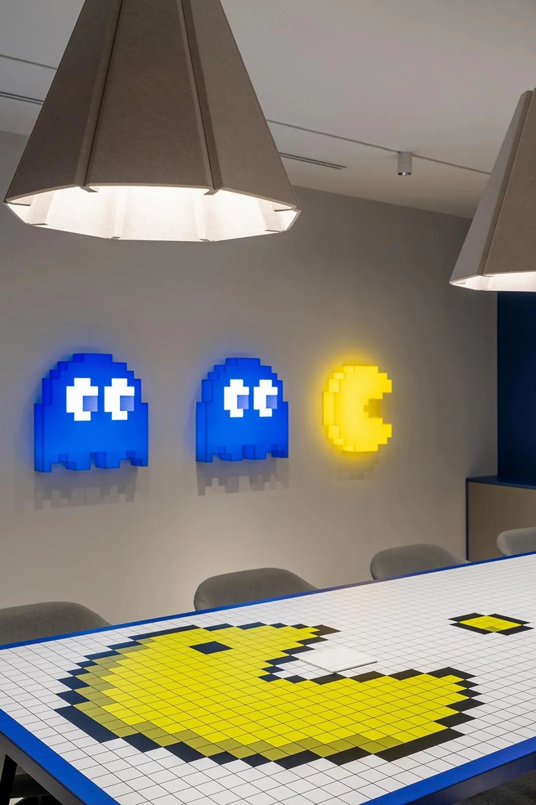厨房区设计为城市咖啡馆风格,混凝土岛台与球形灯饰强化了轻松活泼的氛围。私人办公室采用简约语言,注重声学与照明,支持深度工作。特别打造的会议室以街机游戏《吃豆人》为主题,融入像素装饰与几何灯光,在满足会议功能的同时激发游戏公司特有的创意氛围。