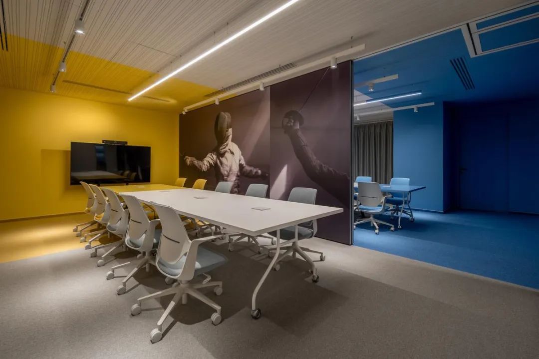 ZIKZAK建筑事务所为乌克兰基辅一家游戏公司打造了一处920平方米的办公空间,以“体育竞技”为核心概念,构建了一个激发创意、促进高效协作的动态工作环境。设计旨在通过空间形态传递企业价值观——活力、自由与竞技精神,呼应团队将工作视为“智力运动”的文化。
