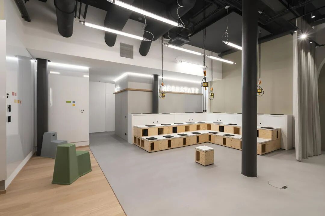 空间位于一座始建于1903年的历史建筑内,原为韦特海姆百货公司的一部分,如今在保护与再利用的平衡中焕发新生。设计团队以“自由配置”为核心,打造出可根据工作行为自定义的灵活办公场景:从开放式厨房、休息区,到可容纳五人的“工作台”区域,再到阶梯式储藏与演讲空间,每一处都可随需重组。