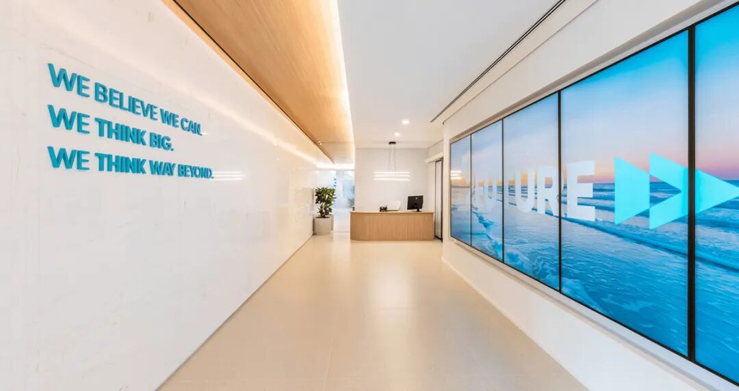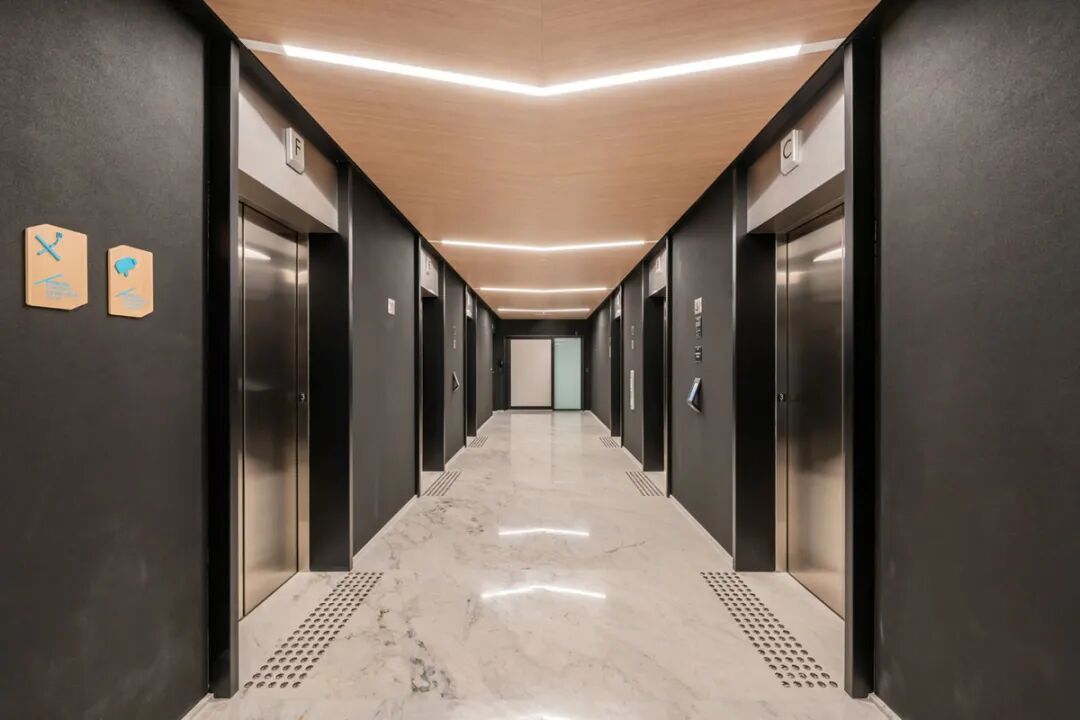 2Future的办公环境设计以“灵动高效”为核心,通过有机线条、中性配色和悬垂绿植,营造自然清新的氛围。空间布局强调创意与健康,例如电梯厅采用黑色乙烯基墙板和箭头型灯带,引导动线。右侧弧线型白色石材墙面指向会议室和工作咖啡区,结合木饰面和绿植,体现环保可持续的设计思路。这种办公环境设计不仅提升员工福祉,还强化了企业价值观。