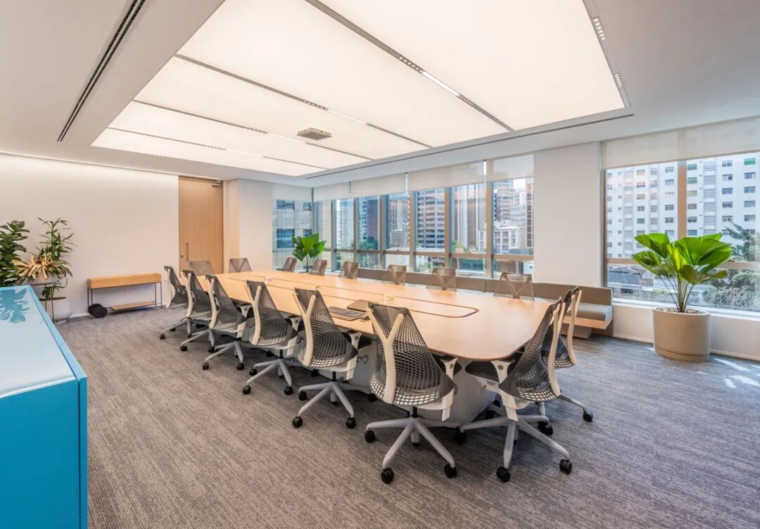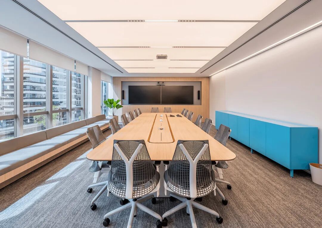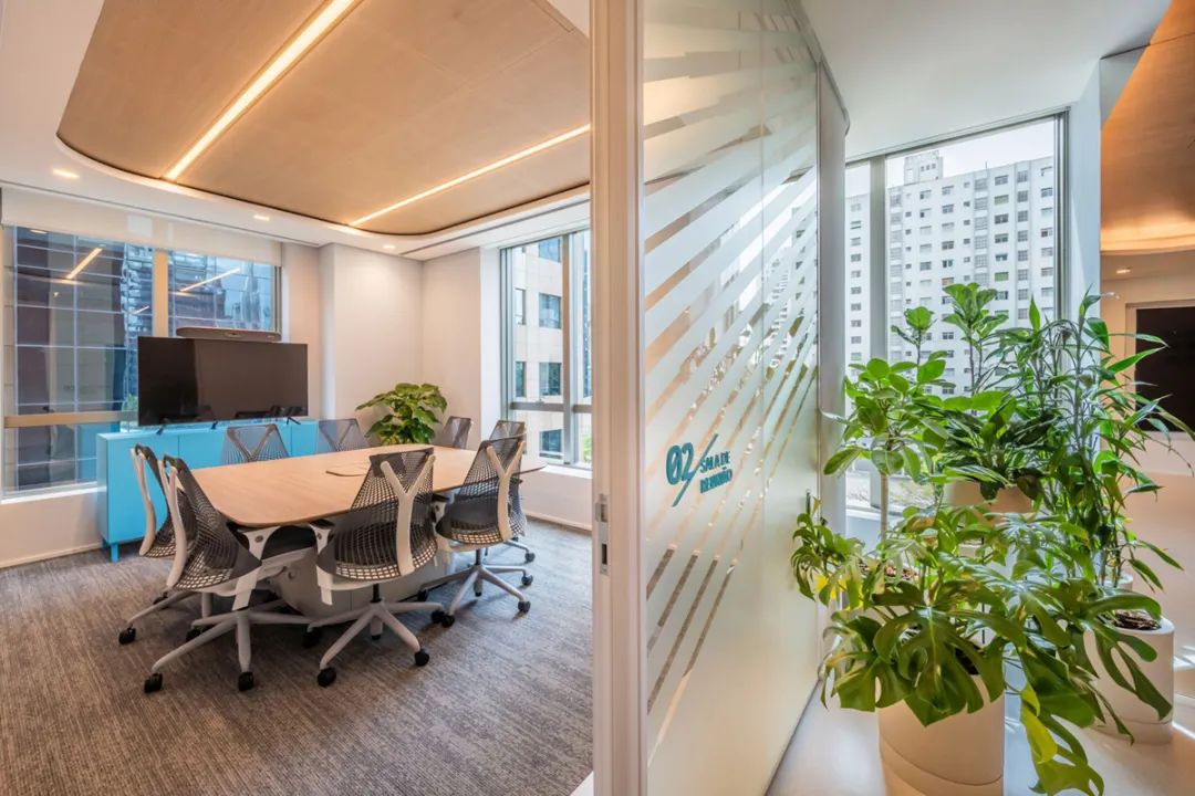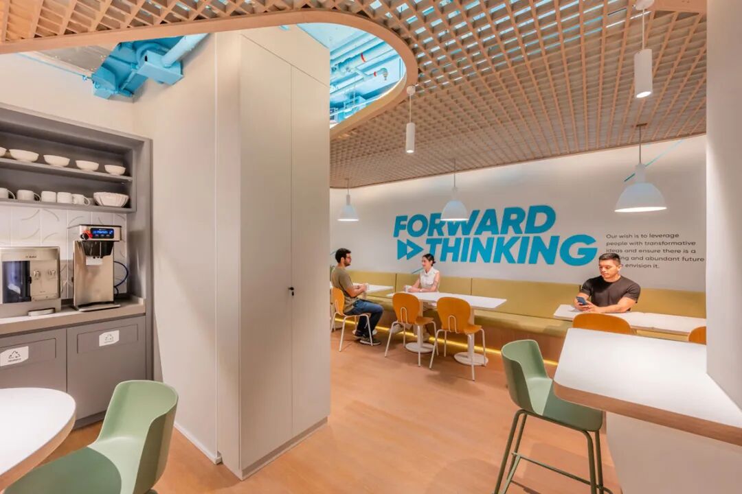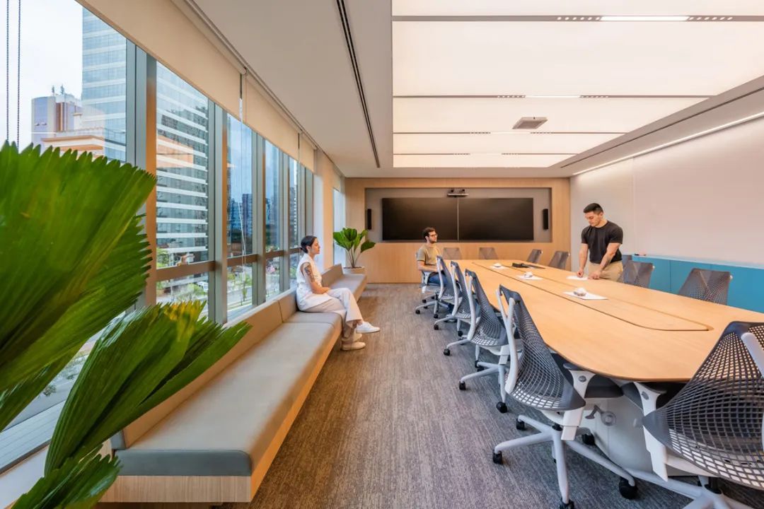 在办公家具方面,设计团队注重功能与美感的平衡。开放工作区中,个人工作站和健康区采用简约暖色木饰面,局部加入白色装饰,打造减压空间。家具选择上,强调定制家具的灵活性,如会议室配备移动分隔墙,可根据需求调整大小,支持非正式会议或研讨会。这种定制家具设计确保了空间的多功能性和适应性,同时融入绿色植物,促进员工健康。