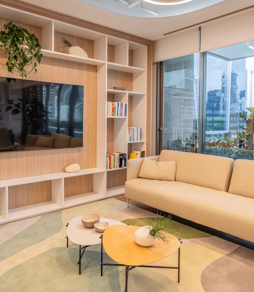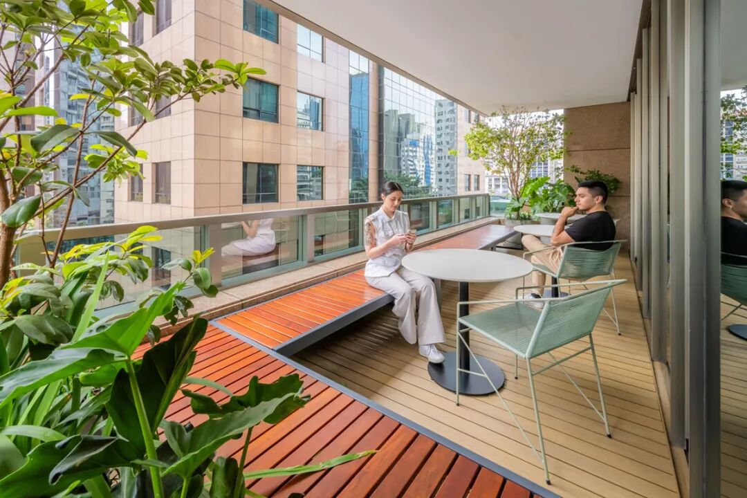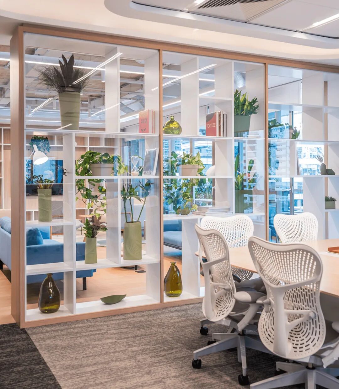 办公环境设计还充分利用原始建筑结构,将凹槽空间转化为团队减压区,突出定制家具的实用性。左侧区域以蜿蜒布局和蓝白色调,象征创意画布,增强灵动感。户外阳台被改造成互动空间,进一步体现办公家具与环境的和谐统一。整个项目通过定制家具和亲自然元素,成功打造了一个高效、温馨的办公环境,完美呼应2Future的投资使命。