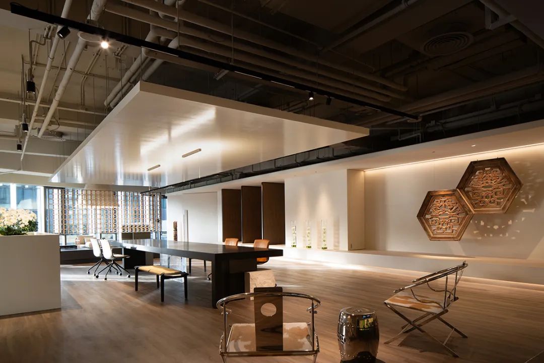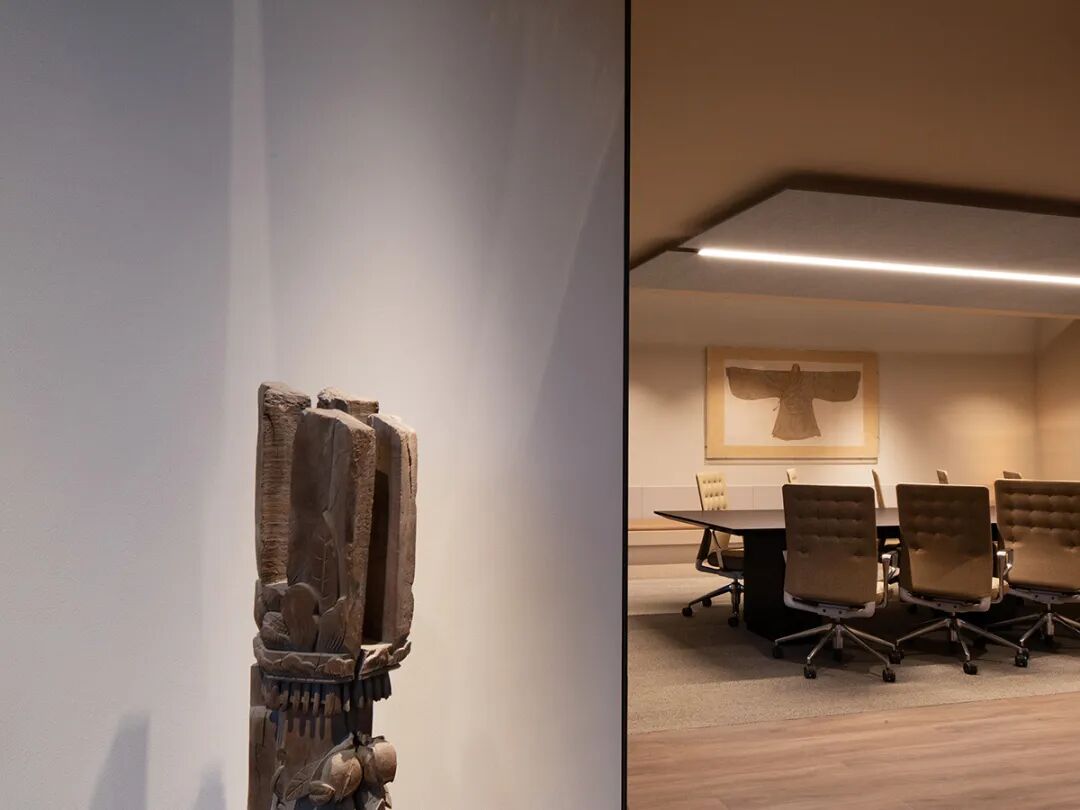 整体办公环境设计以“流动的能量”为核心。开放式布局与私密角落并存,落地窗将城市景观和自然光引入室内,四季变幻的窗外景色成为空间最生动的背景。软装设计上,我们运用了艺术画作、绿植、织物等元素,柔化硬朗的建筑线条,并特意保留了老办公室的部分艺术品,经过重新演绎后融入新空间,让历史与当下对话。每个区域——无论是头脑风暴区、原型制作间还是休闲茶水间——都通过不同的软装搭配,激发使用者的创造力与归属感。
