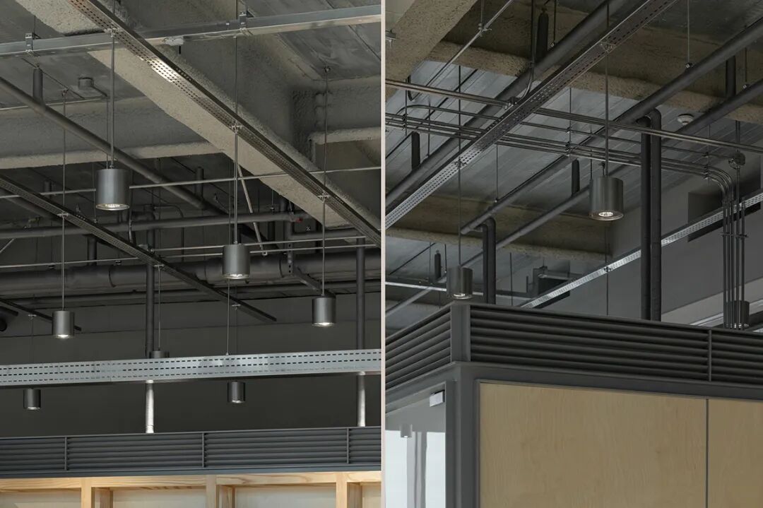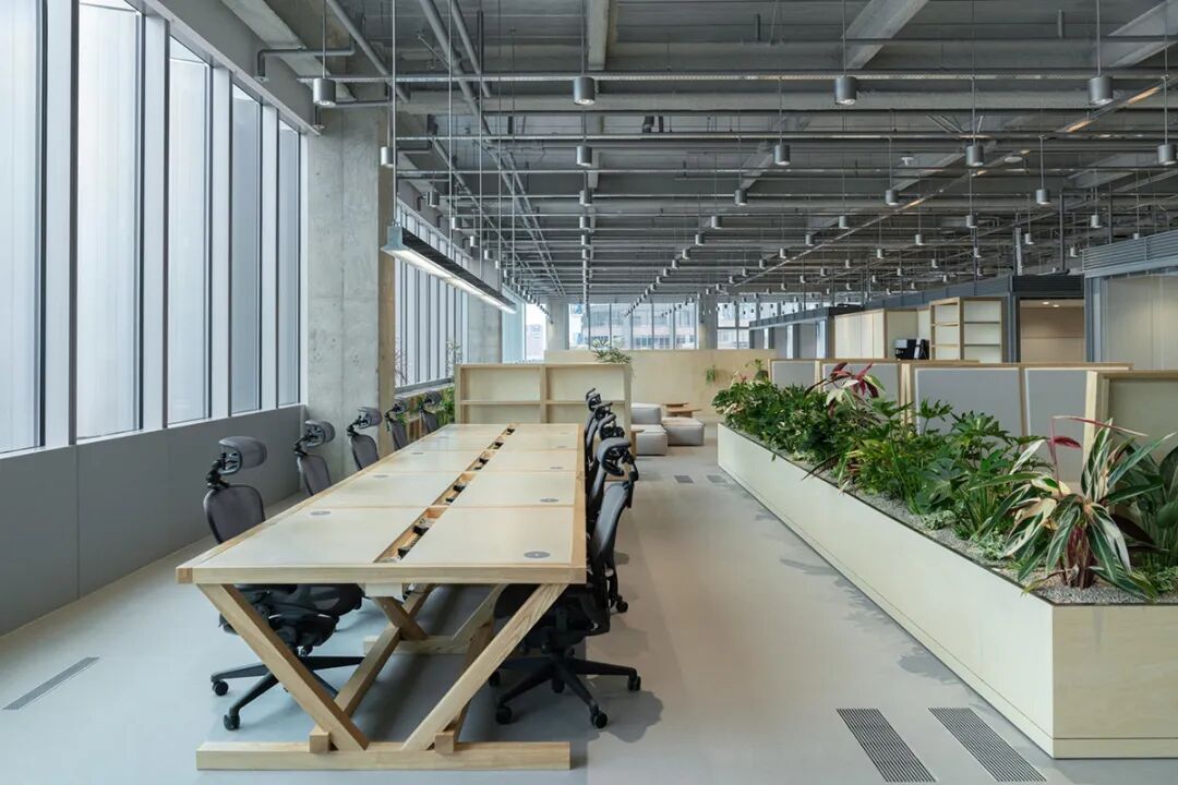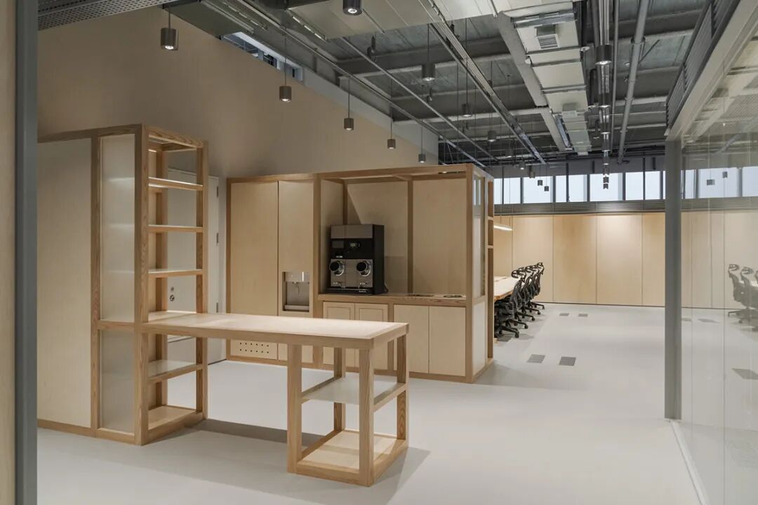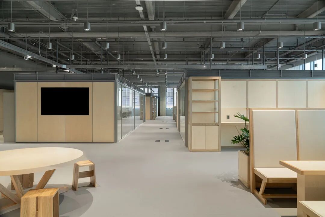 踏入办公室,首先映入眼帘的是由400盏银色吊灯与金属网格架构成的系统化loft天花,营造出通透利落的工业风视觉冲击。然而,与顶部硬朗线条形成鲜明对比的,是地面活动区大量使用的**定制办公家具**。设计师精选自然肌理的原木色家具,配合木质饰面包裹的功能盒子,打破了工业风的冷峻,注入了温暖惬意的氛围。这些**定制办公家具**不仅是功能的载体,更是光影的画布。白昼时分,阳光透过玻璃幕墙洒入,在木质表面形成变幻的光影韵律;夜幕降临时,暖色灯光在木饰面与金属之间流转折射,整个空间弥漫着令人安适的温润质感。这种**办公环境设计**充分体现了对员工包容与福祉的关注,让办公空间成为令人流连的日常场景。