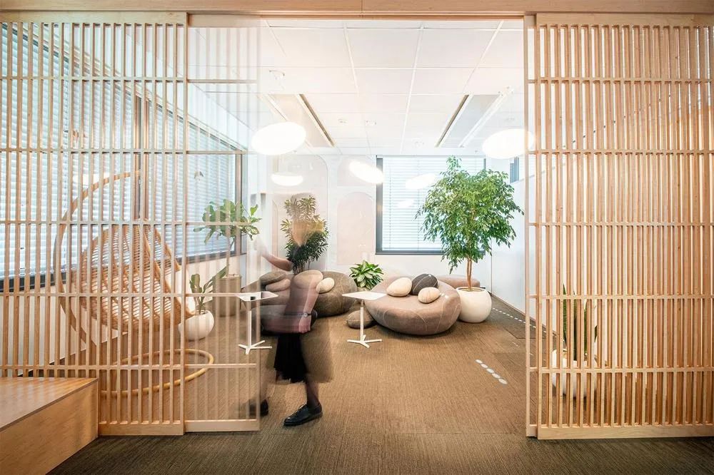 此外,灵活的窗帘、有机形态的座椅、以及模仿日式微型植物的绿植造景,进一步强化了空间的呼吸感。墙面采用局部涂漆,利用不平整的肌理创造出动态视觉效果,让整个办公室在第一眼就抓住访客的注意力。