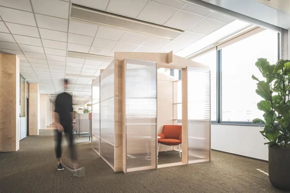在办公环境设计中,隔断往往被忽视,但沃达丰项目把它变成了亮点。设计师采用了移动式日式推拉墙——带导轨、轻便易操作,即使关闭也能透光,既划分空间又不牺牲通透感。