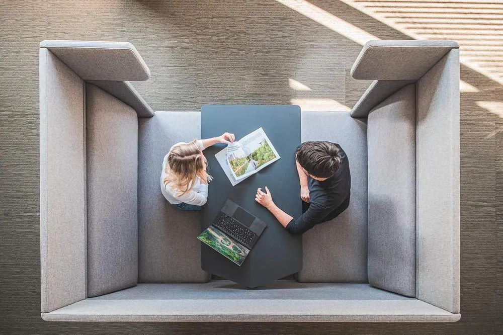 可复制经验:用移动隔断取代固定墙体,用高靠背沙发和共创站替代封闭会议室