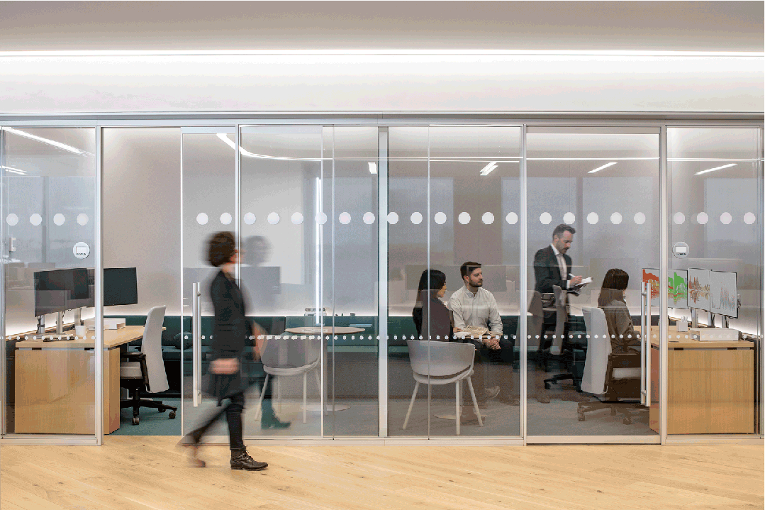 外部屏幕同步播放内容,整个楼层东侧可变为全员聚集的大型开放会议空间