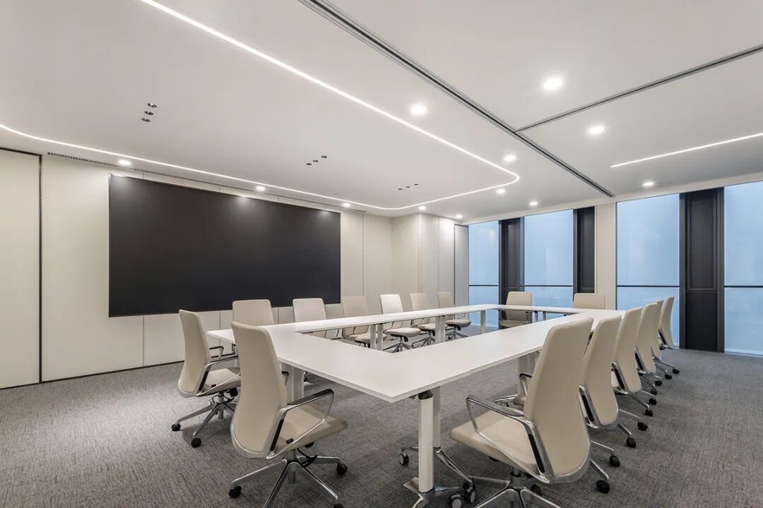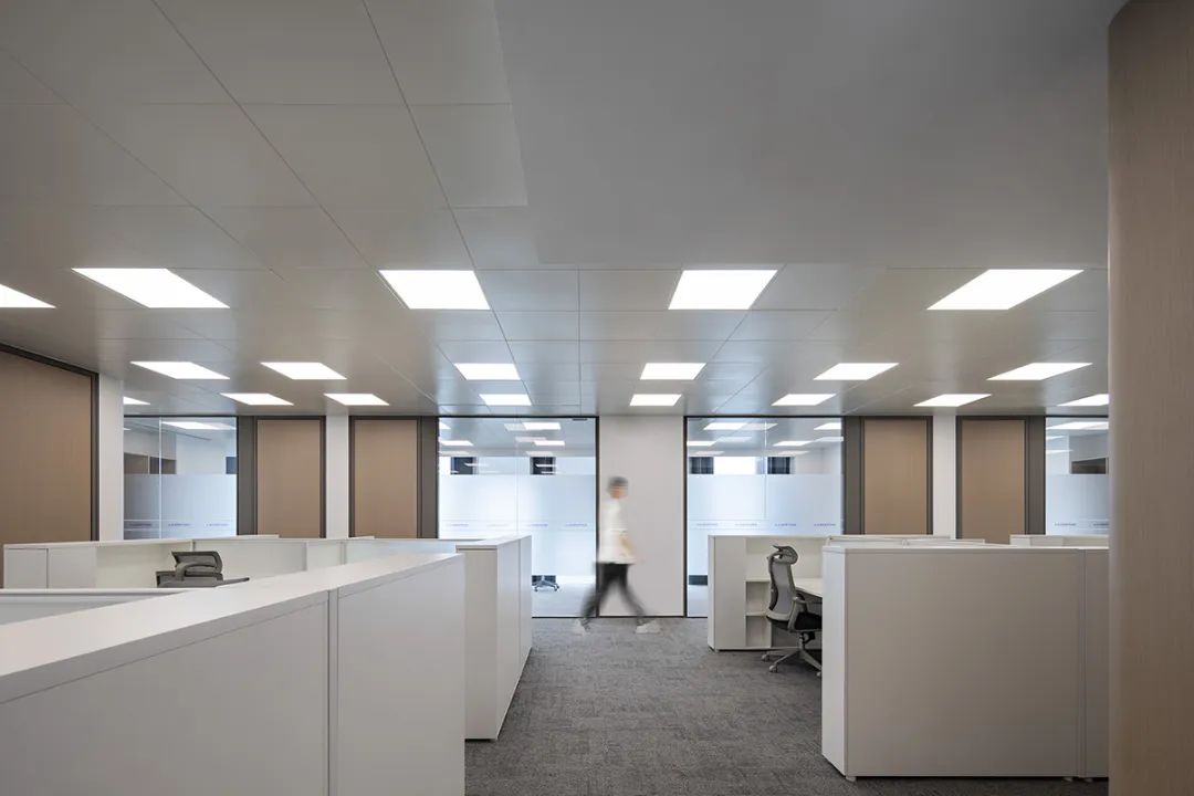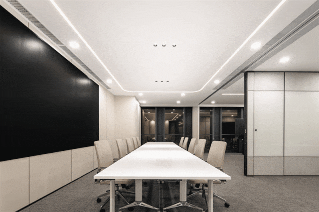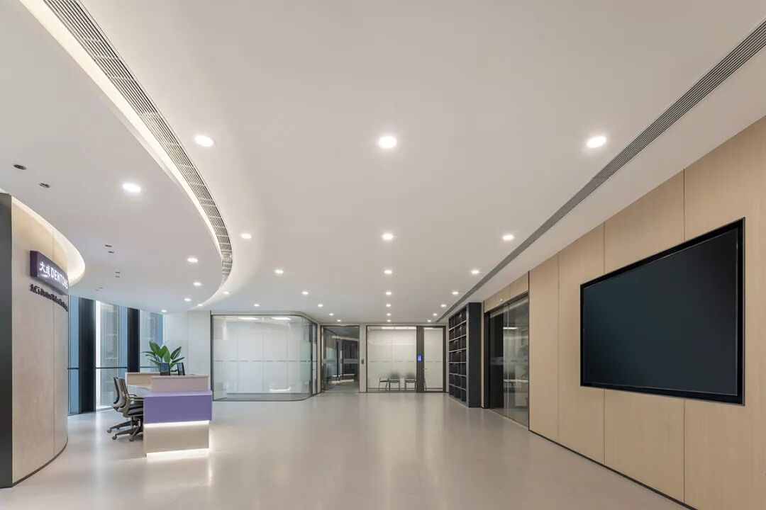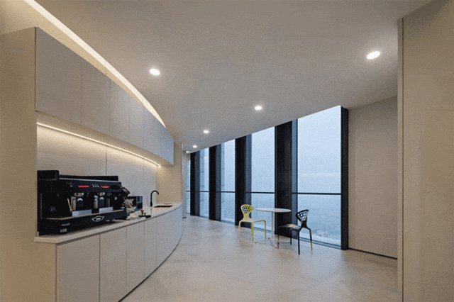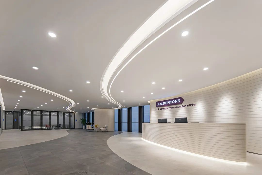 室内设计语言融合斯卡帕的曲折手法,以办公环境为载体,通过线性灯的蜿蜒排布与地脉曲线的延伸,隐喻律所对永续发展的坚守。天地相应的设计中,曲线造型模拟潺潺流水、层叠山脉与变幻云翼,立面采用天然石材,既寓意“浑然天成的顺势”,也以肌理质感隐喻中国文化中“坚如磐石”的信念;地面流淌的曲线则复刻自然山川的行走痕迹,使办公环境兼具自然意境与人文深度。