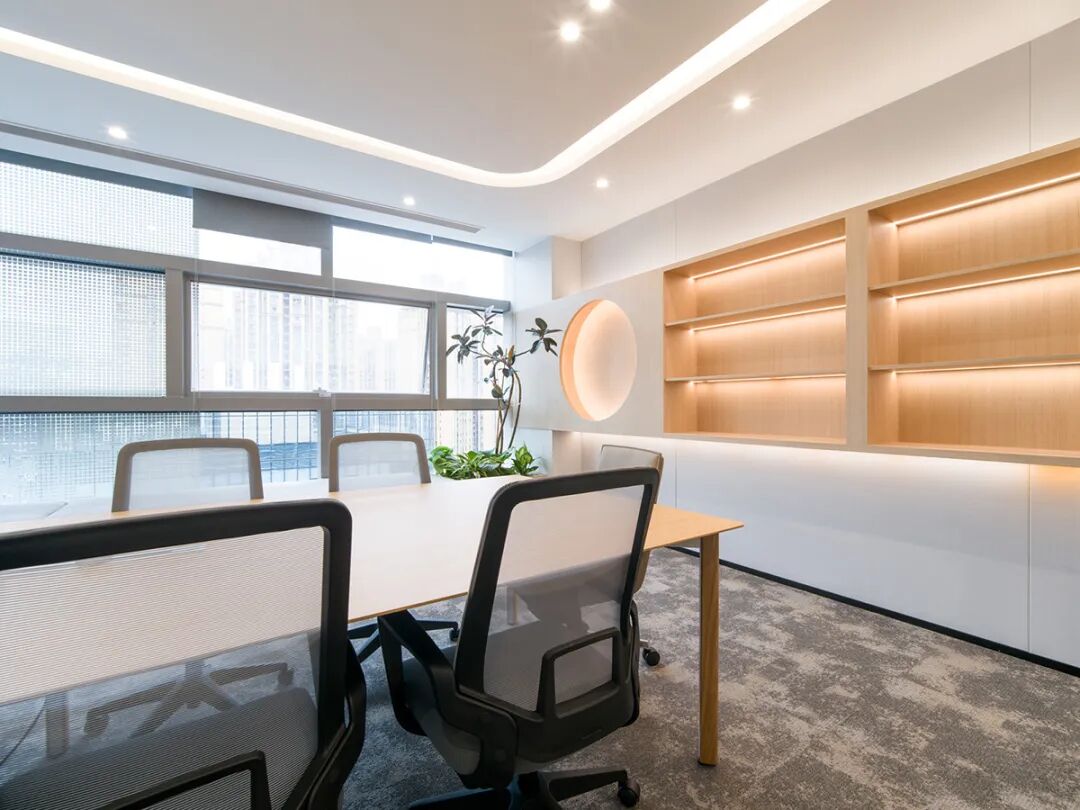 与此同时,设计师在整体空间设计规划中采用了主次分明的色彩策略。全遮光帘的运用不仅实现了光量调节,更在开合之间创造了丰富的光影变化。天然材质的办公桌、网皮面的办公椅与点缀其间的绿色植物形成了和谐统一,营造出素雅、简练的空间调性。这种设计不仅满足了功能需求,更兼顾了审美趣味,让员工在忙碌的工作中也能感受到内心的平静。