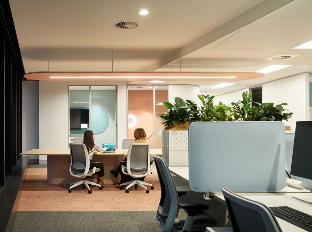 数据驱动设计成为空间规划的核心。设计团队通过追踪员工行为动线和空间使用效能,精准定位各功能区需求,打造出100%固定工位与敏捷工位的混合布局系统。"细胞集群"布局为每个部门配置了固定工位区、协作交流区、安静工作区等多元空间,并配备声学优化和生态绿植,兼顾团队协作与个人专注需求。