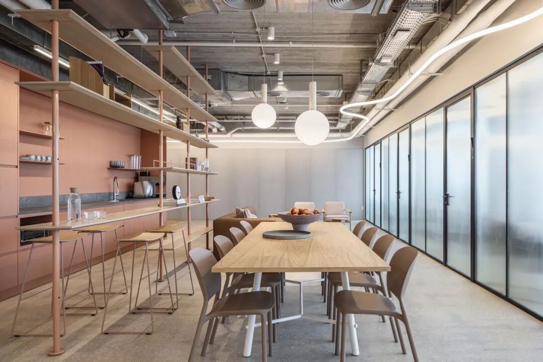 裸露的混凝土天花板与保留原貌的混凝土地面,营造出开放、轻松的空间基调。与此同时,细致的家具选型与对比鲜明的围护结构设计,使空间在粗犷与精致之间取得平衡。正如数字广告领域强调节奏与叙事,办公环境同样通过“场景”组合,讲述品牌故事,激发创意潜能。