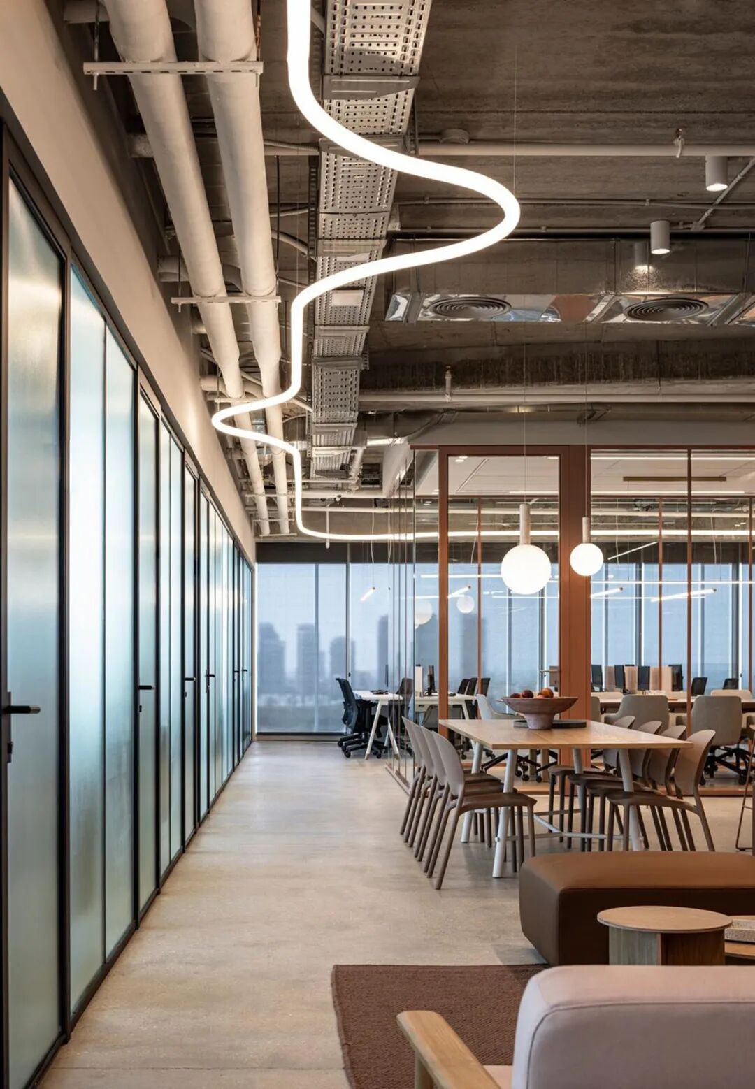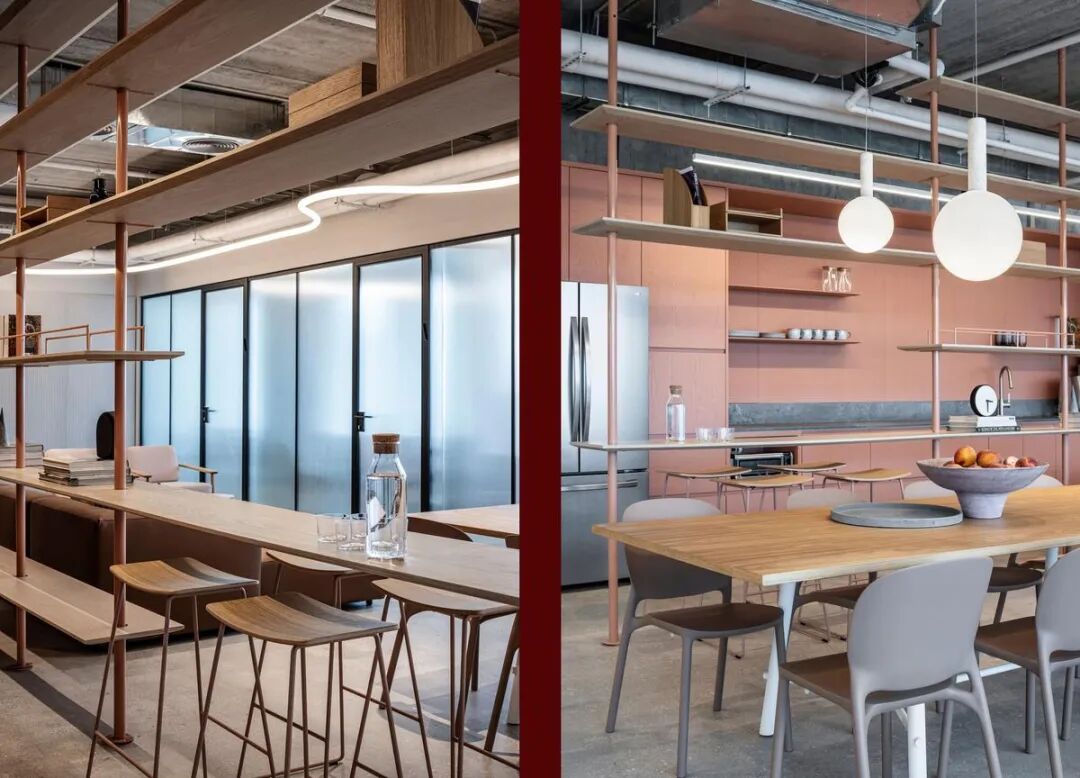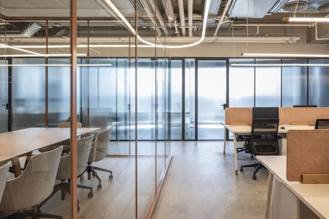 本案中,定制办公家具成为空间节奏感与视觉层次的重要组成部分。设计通过精心选择的家具、木工与材料,营造出既休闲又精致的氛围。玻璃隔断、条纹饰面墙与可调节照明装置相辅相成,赋予空间动感与灵活性,体现了办公家具在塑造企业文化与工作方式中的核心价值。