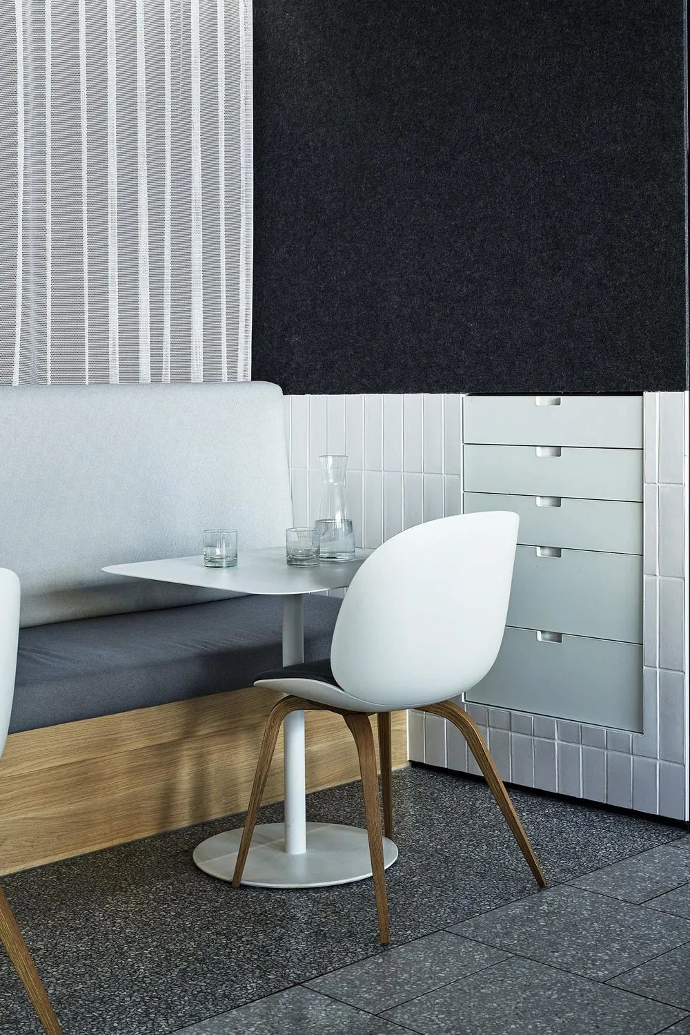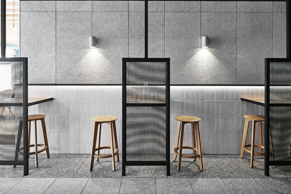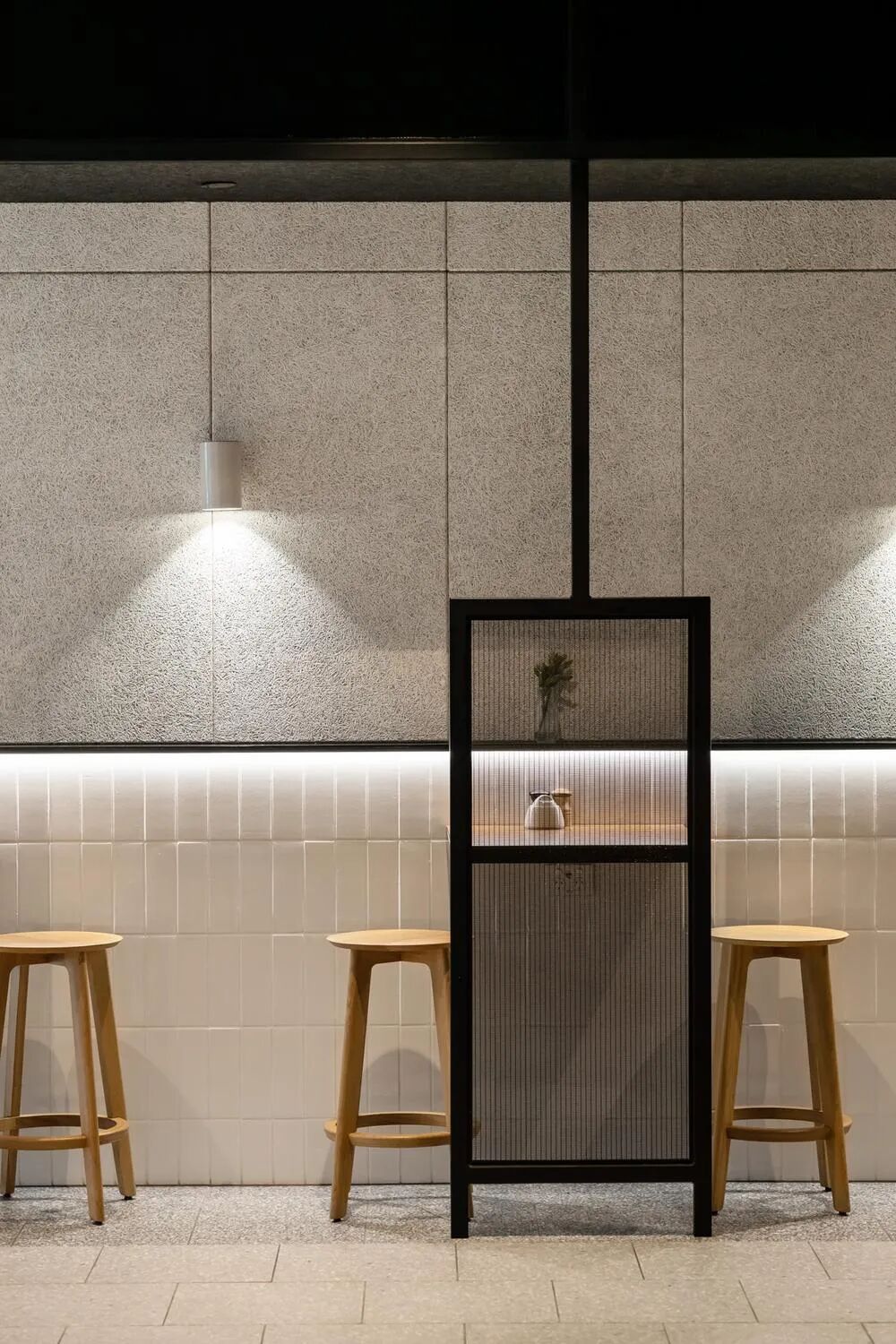 入口区以浅灰色水磨石与胡桃木格栅构建柔和过渡,定制波浪形金属屏风既保证私密性又维持空间开放感。运营时段采用"日咖夜酒"模式:白天通过可升降桌面满足40人会议需求;傍晚自动切换至宴会模式,伸缩隔断与轨道射灯快速构建社交场景。