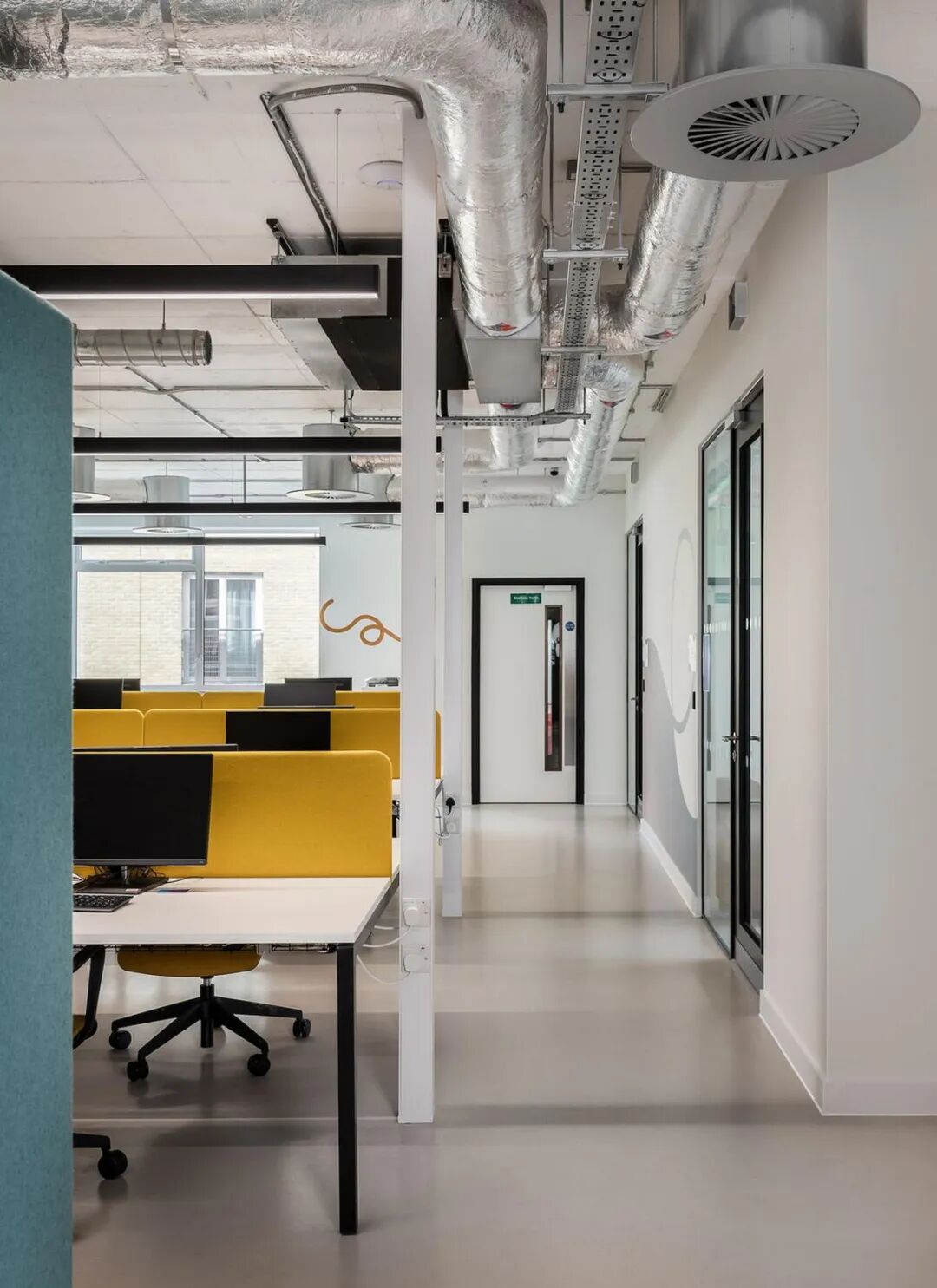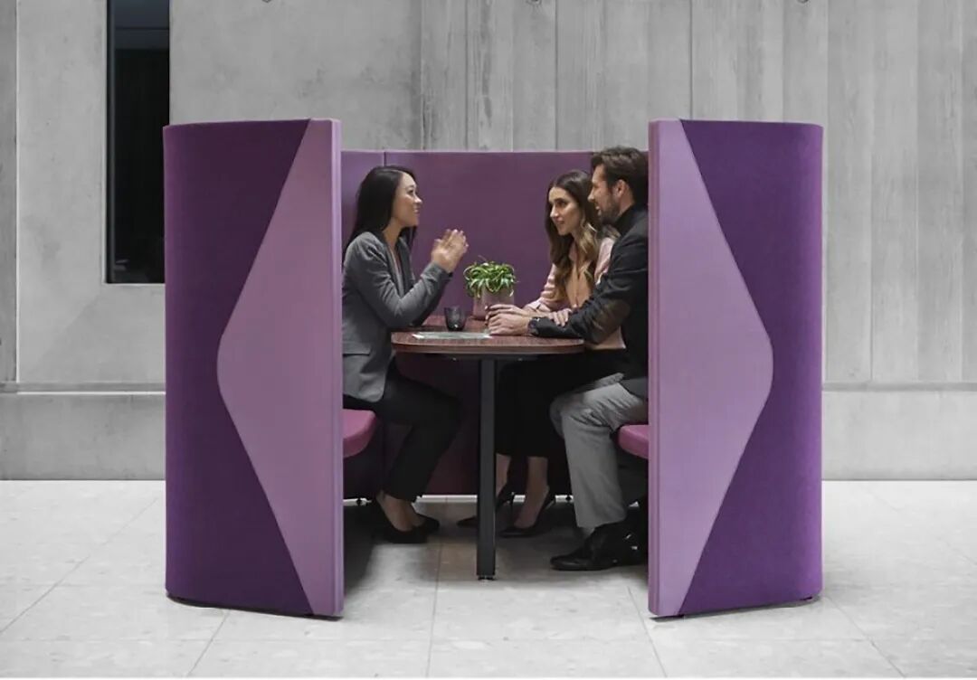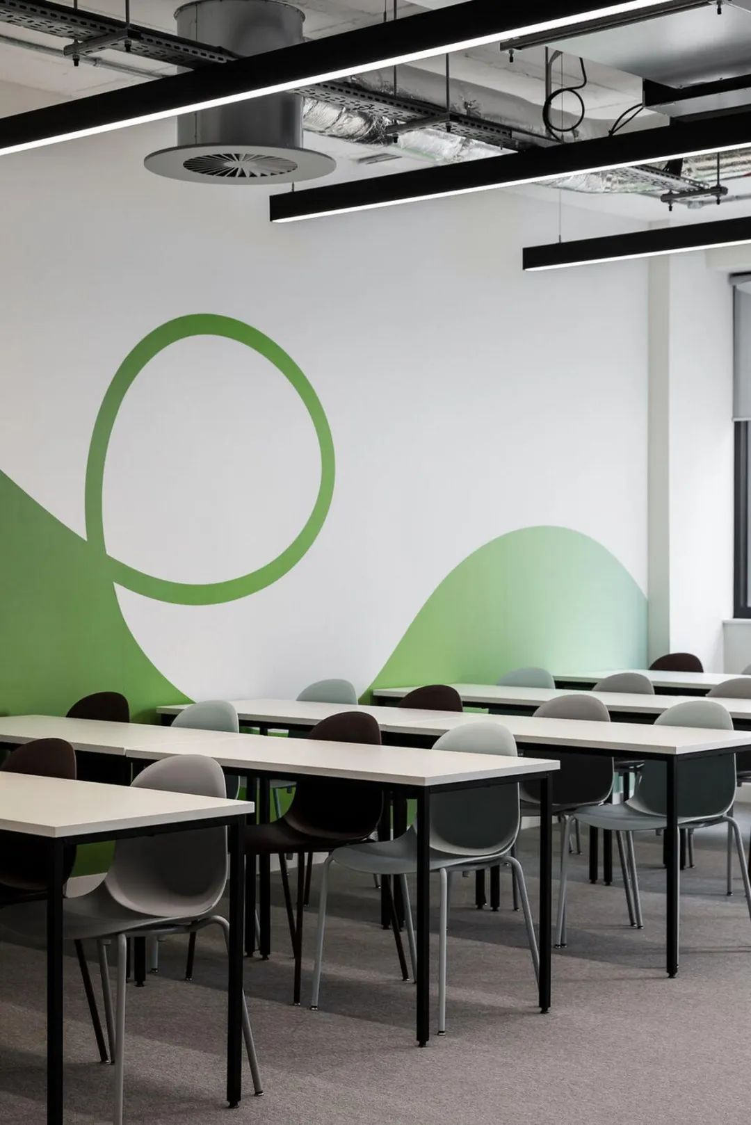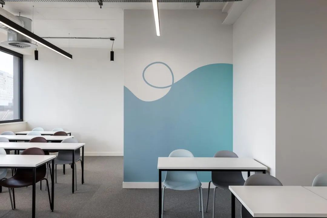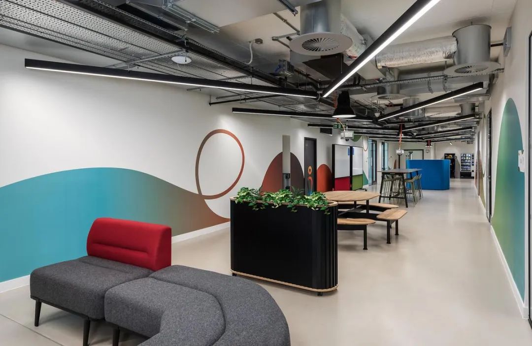 在连接走廊区域,设计团队设置了带有小型屏风隔断的两人座,适合学生休闲交流或自习,体现出对大学校园环境设计中人性化细节的关注。