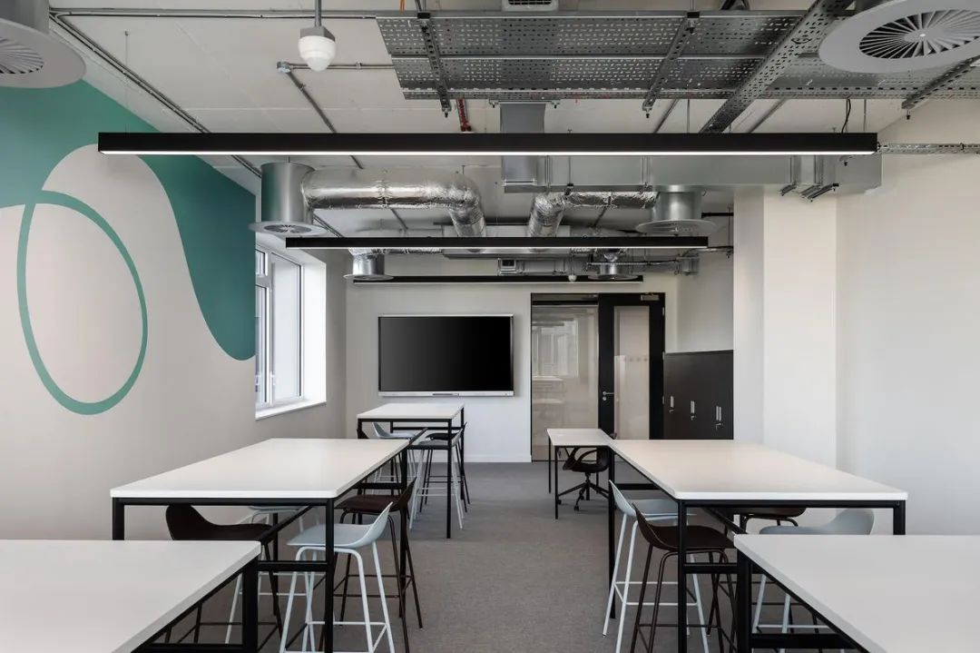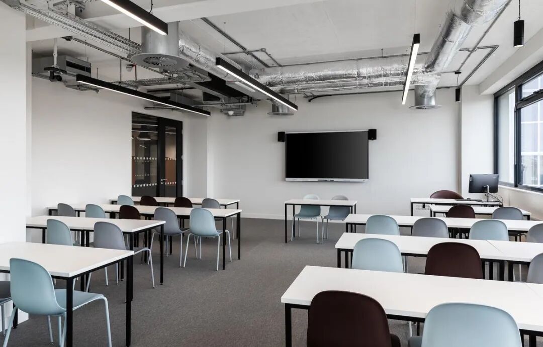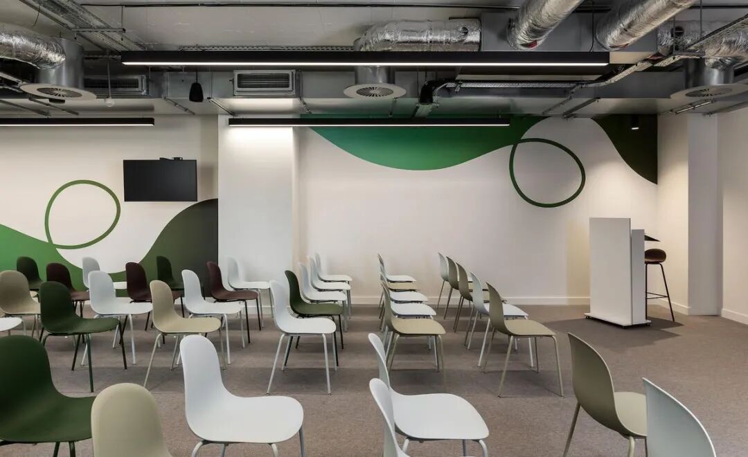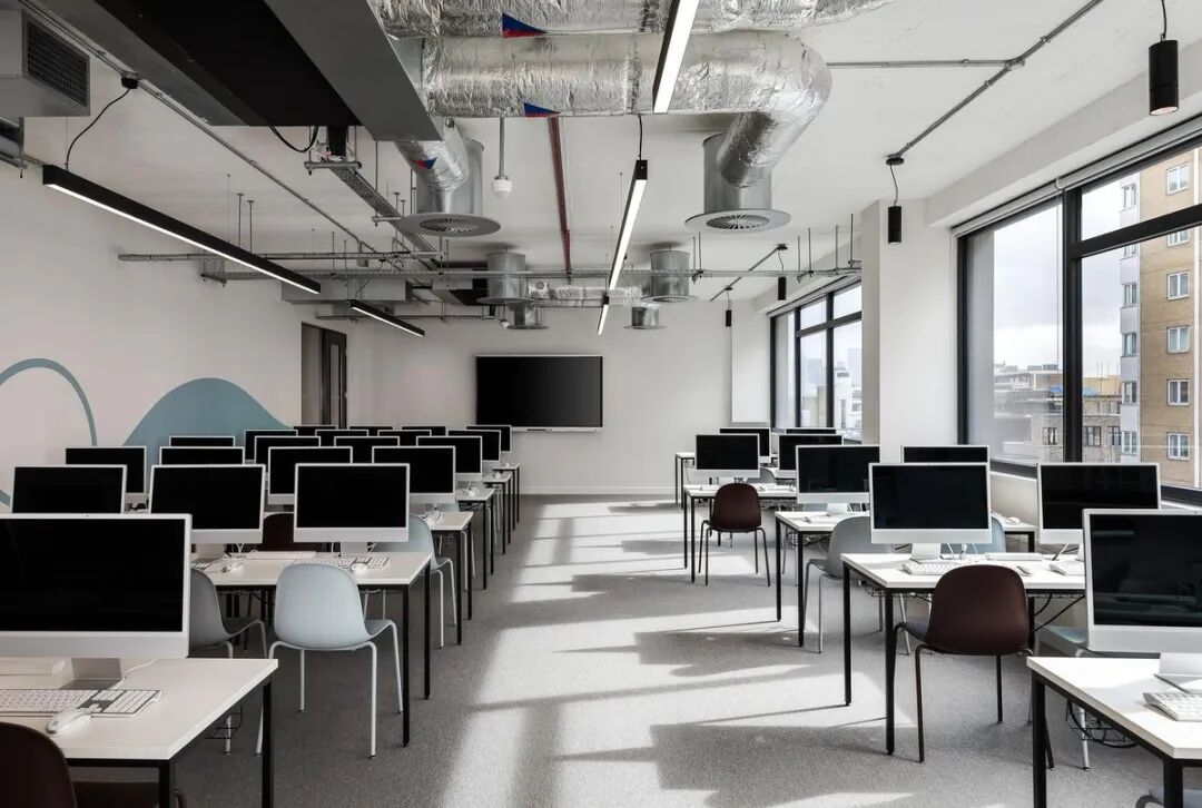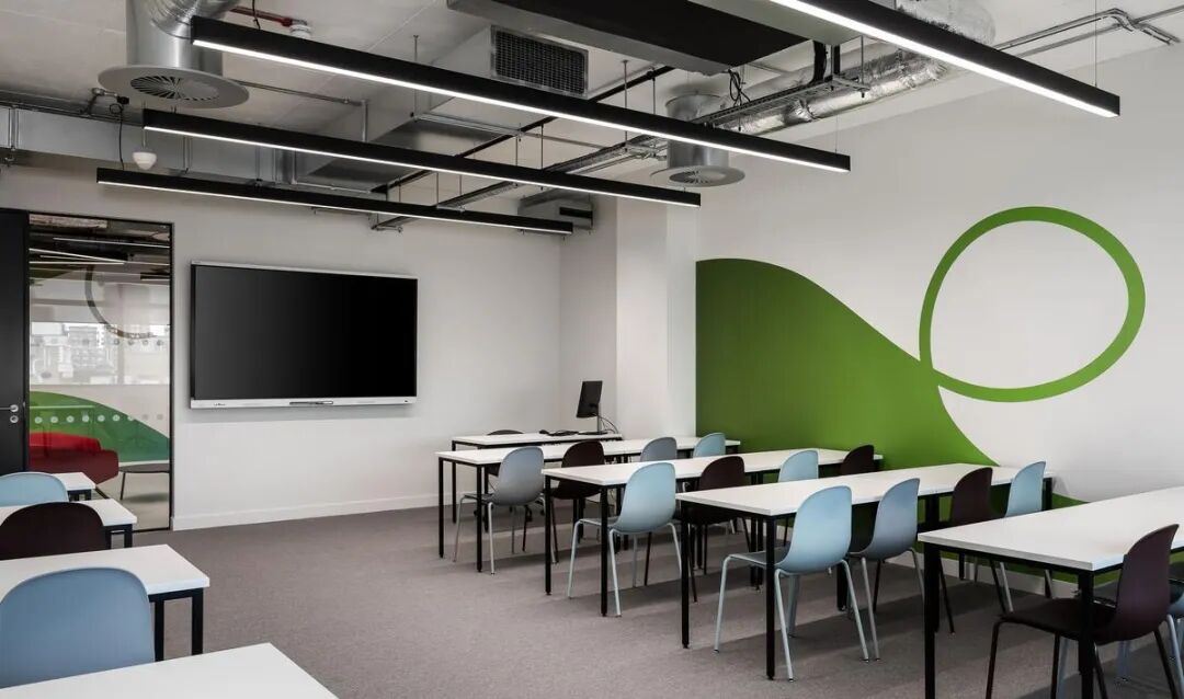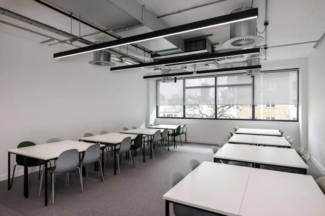 本次改造涵盖多个功能区域:配备先进设施的演讲厅、两间可灵活分隔的会议室、一个可从日间咖啡馆模式转换为晚间活动模式的灵活多元空间,以及一处连接皇后大道北端的校园阶梯式露台景观。
