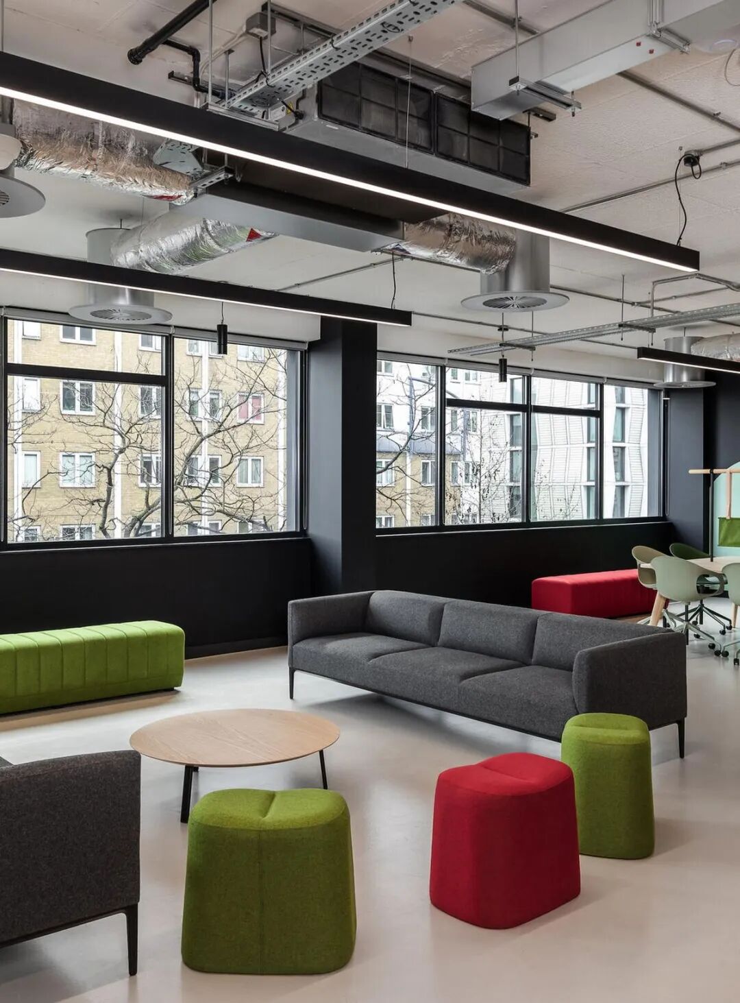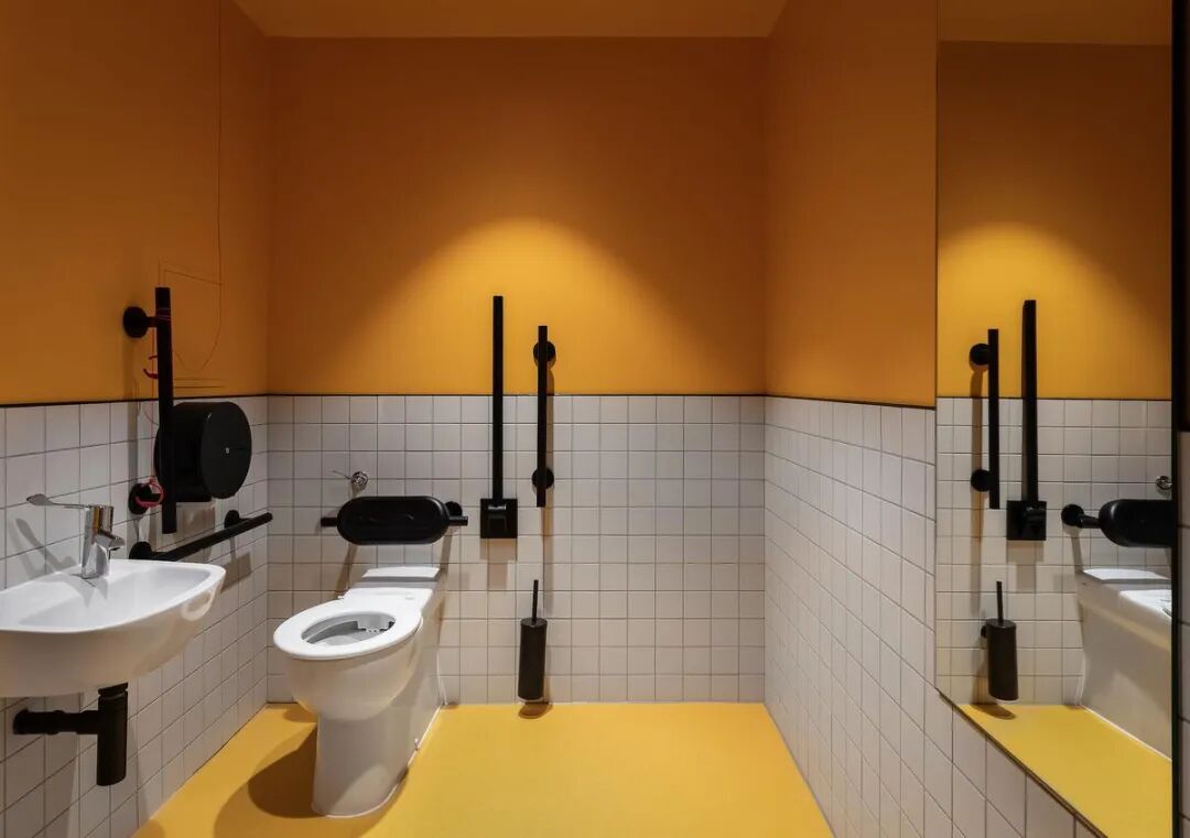 灵活性是本案的另一大亮点。为满足日间作为传统咖啡馆、夜间支持校园活动需求,空间布局采用“固定+移动”的组合策略:沿墙设置固定家具,中央区域配置可轻便推移的定制沙发与可堆叠桌椅,空间可快速切换为鸡尾酒会等社交活动场景。配套的商业厨房支持24小时独立运营,使该空间成为校园内全天候活跃的交流节点。