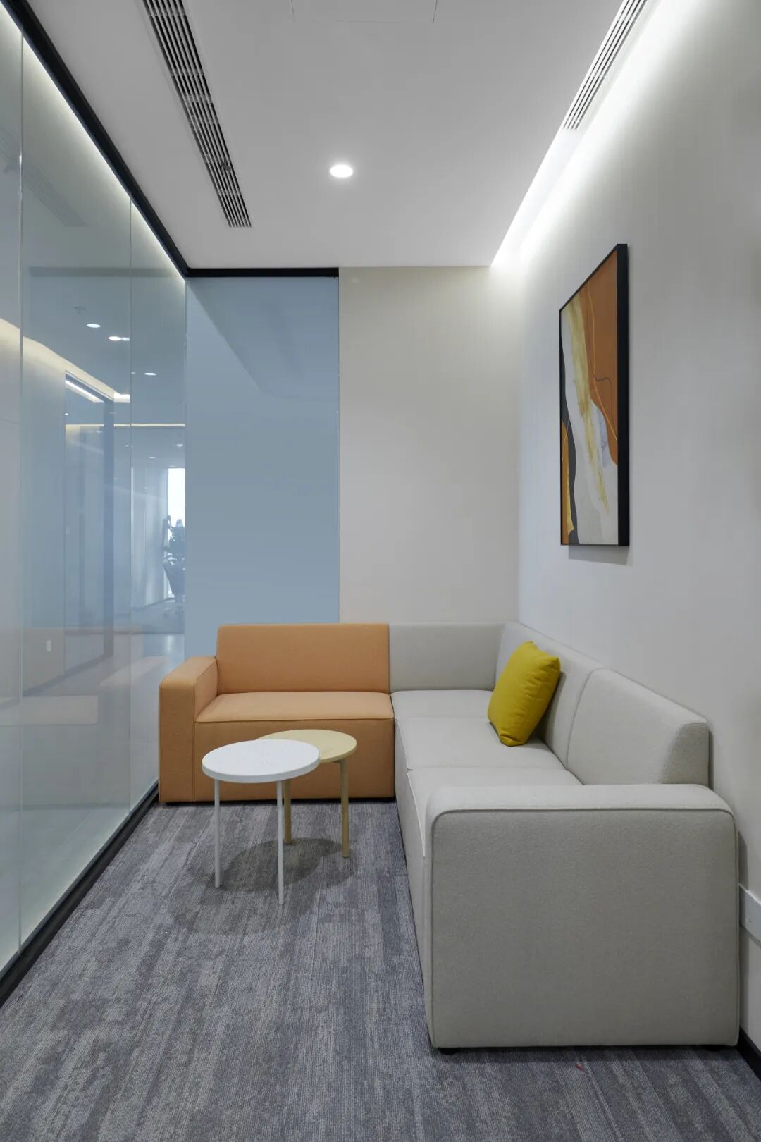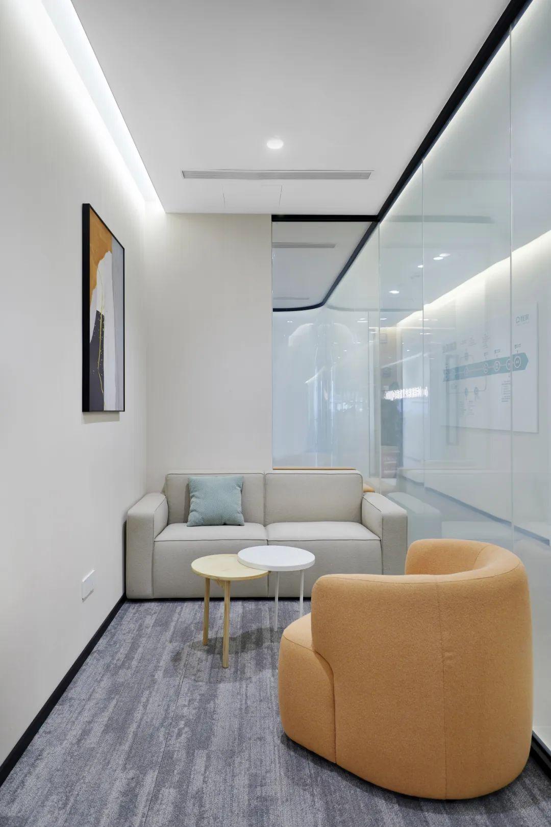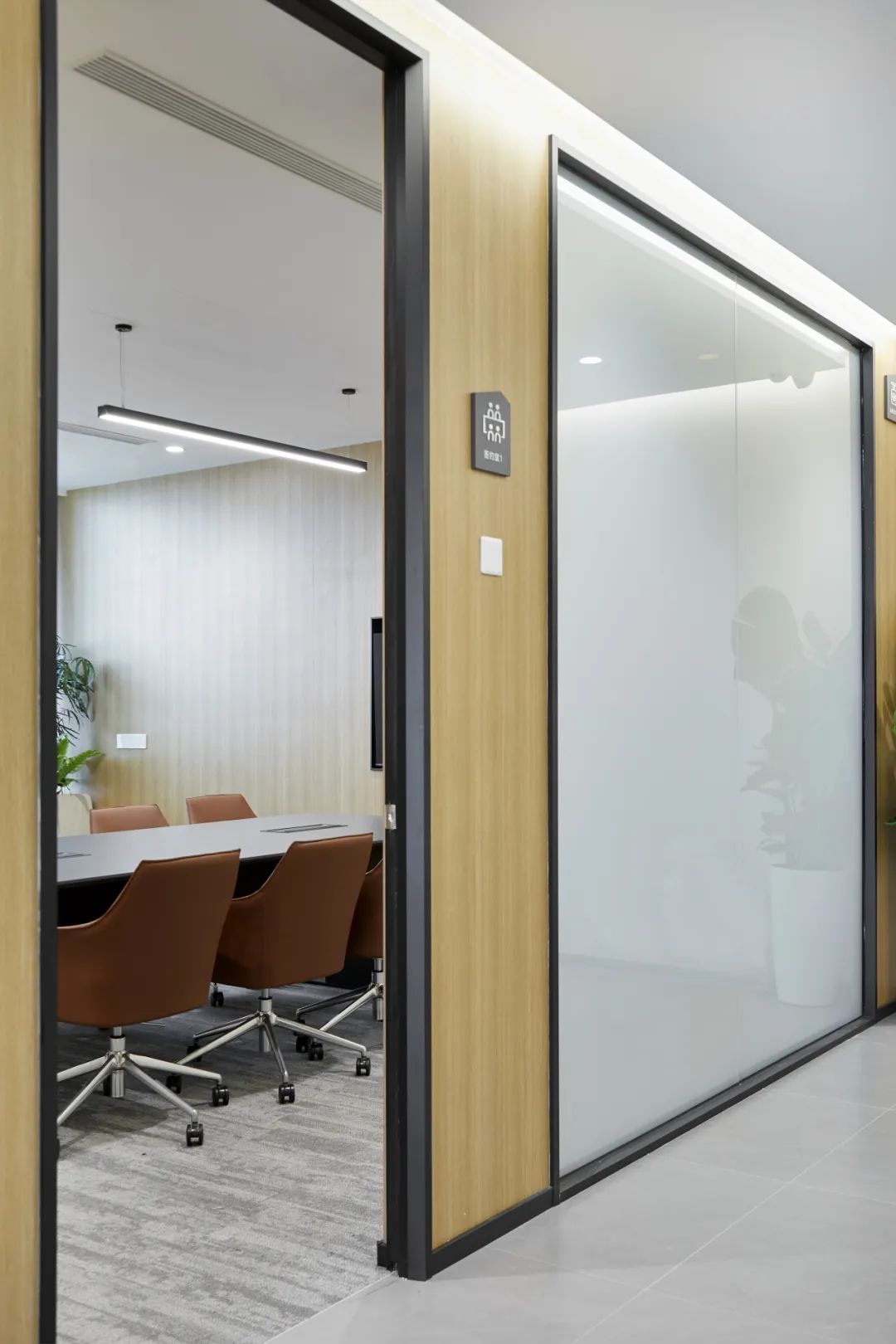 It is worth mentioning that all furniture in the shared office area adopts a unified modular design: the thickness of the desk board is uniformly 25 millimeters, the height difference of the mobile unit is controlled within 3 centimeters, and even the spacing between power sockets is maintained at a standard interval of 60 centimeters. This highly standardized customization system ensures both visual unity and compatibility between different furniture modules, keeping the space in an orderly yet dynamic state.